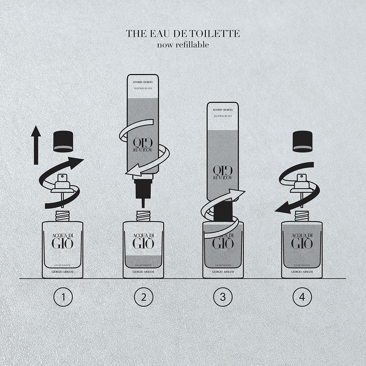 As part of Giorgio Armani’s commitment to a better future, the icon is now refillable: each format of ACQUA DI GIÒ EAU DE TOILETTE is designed to be unscrewed and refilled at home with the 150ml refill bottle sold separately.