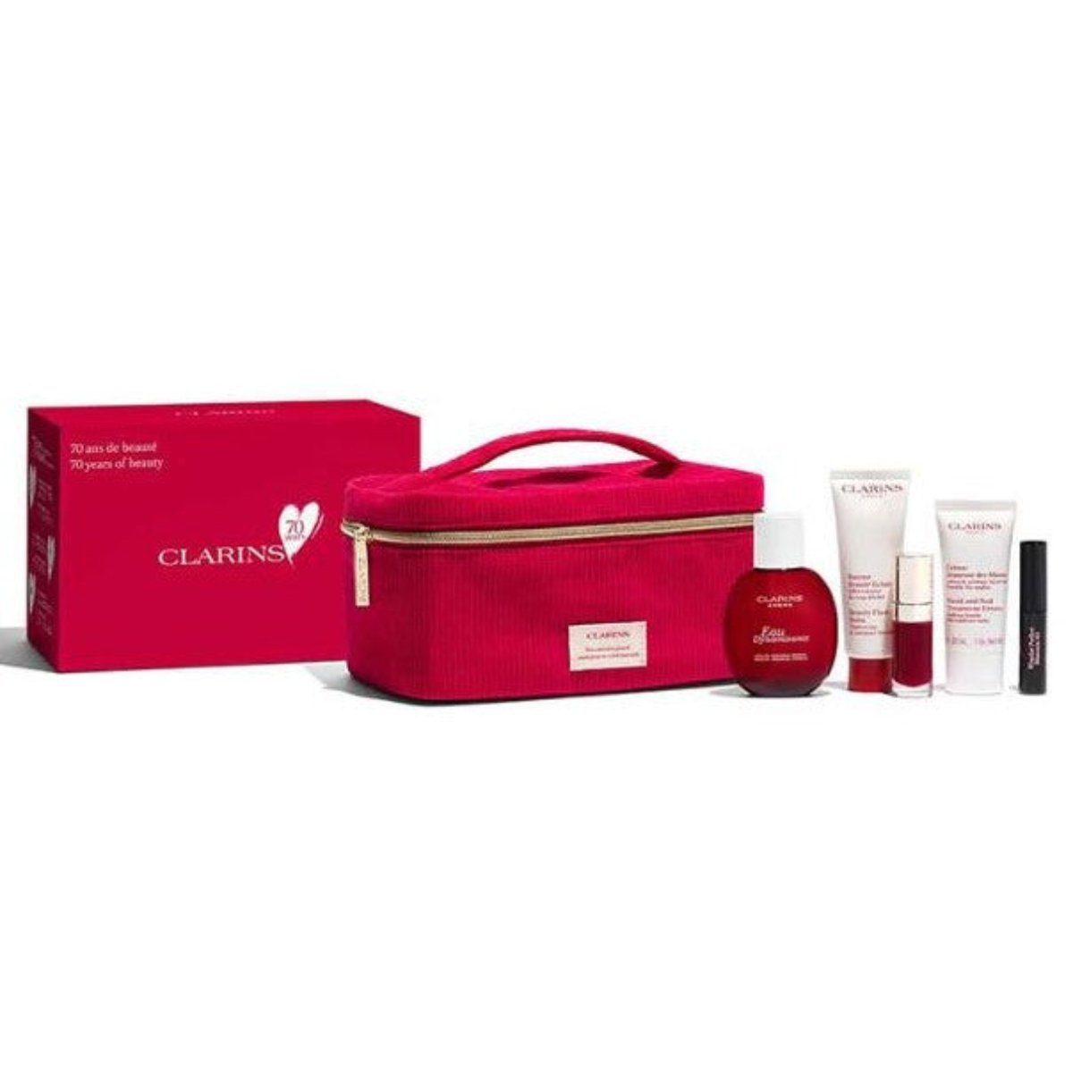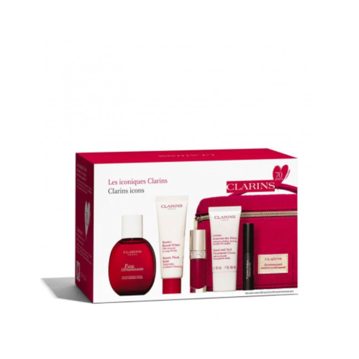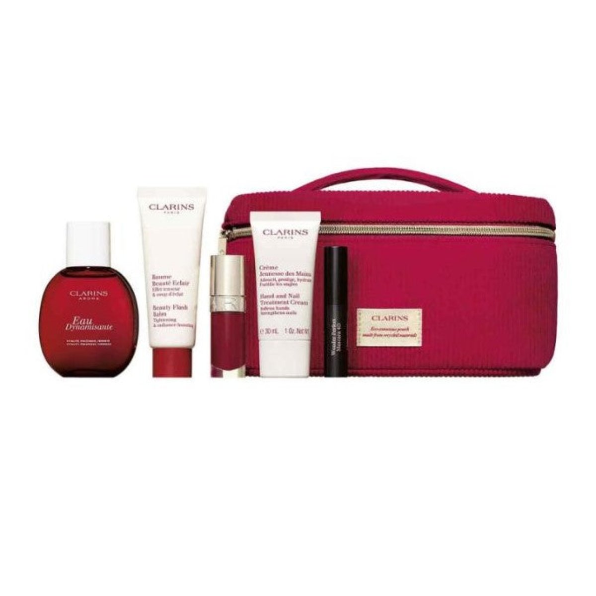The legendary Hand and Nail Treatment Cream, which is like a true glove of beauty that moisturizes and beautifies the skin. Eau Dynamisante, the first Treatment Fragrance to combine a fragrance with the benefits of plants. Beauty Flash Balm, a magic treatment that boosts radiance. Lip Comfort Oil, the power of Clarins oils to nourish and enhance lips. Wonder Perfect Mascara, for a mesmerising look. A red velvet vanity case that contains this innovative collection of Clarins products.
