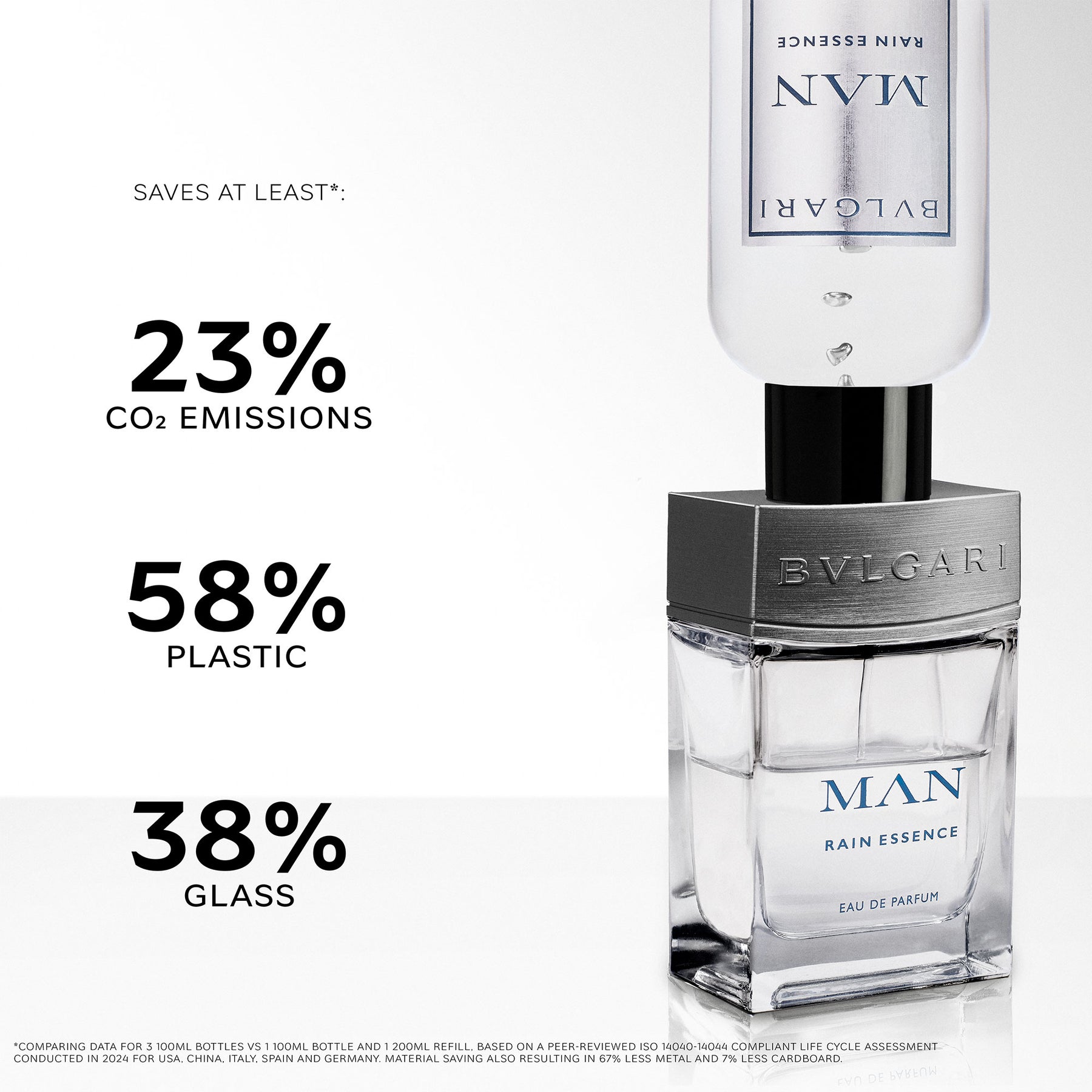 The impact of this new format, developed with eco-design principles in mind, is both significant and measurable. By opting for a 200ml refill crafted from 40% recycled glass—used in combination with an existing 100ml bottle—instead of purchasing three separate 100ml flacons, clients can reduce their carbon emissions by at least 23%. In addition, a substantial material reduction is achieved: 67% in metal, 58% in plastic, 38% in glass, and 7% in cardboard.