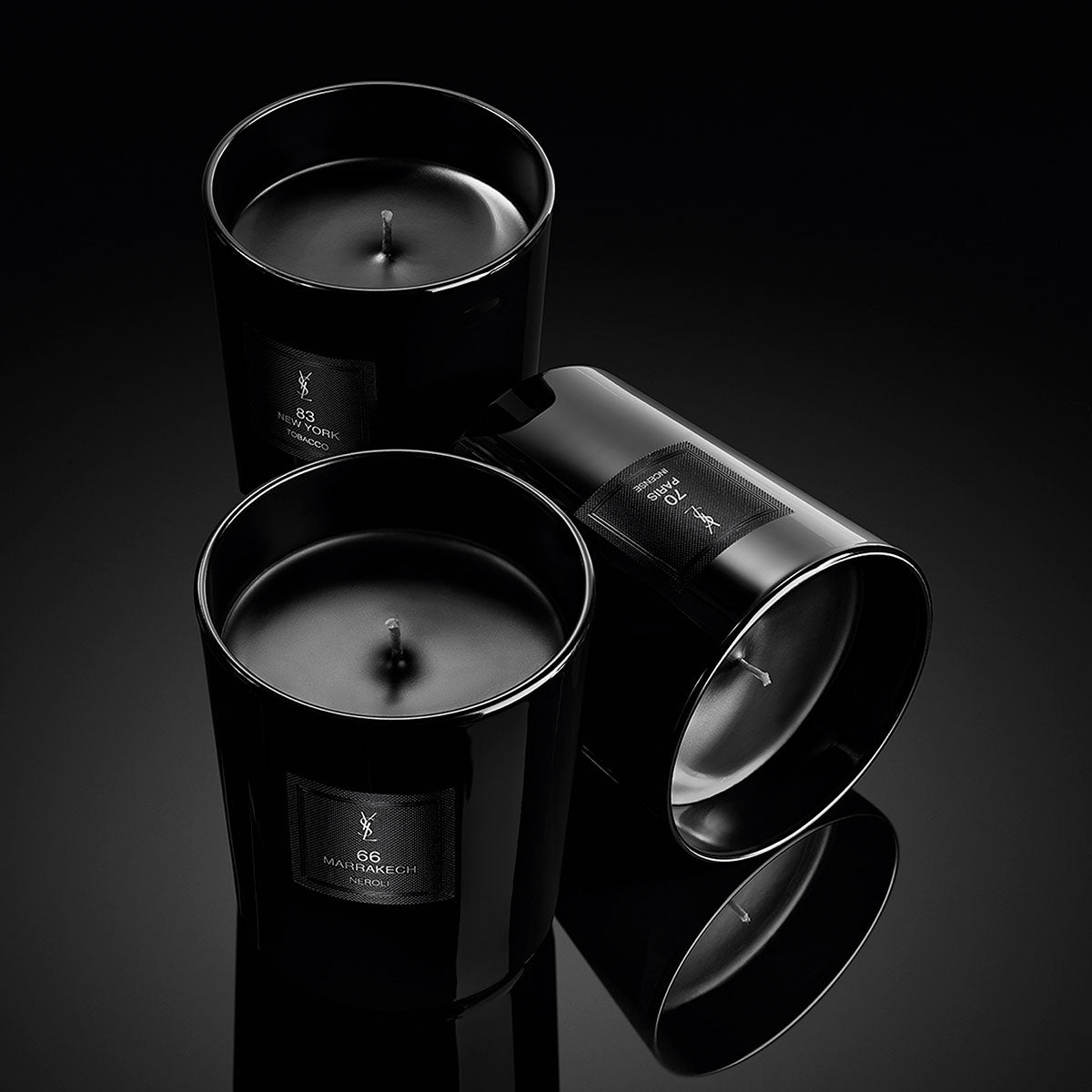 To create the candle's visually striking appeal, black wax is poured into black glass, echoing the form of the Yves Saint Laurent tuxedo.