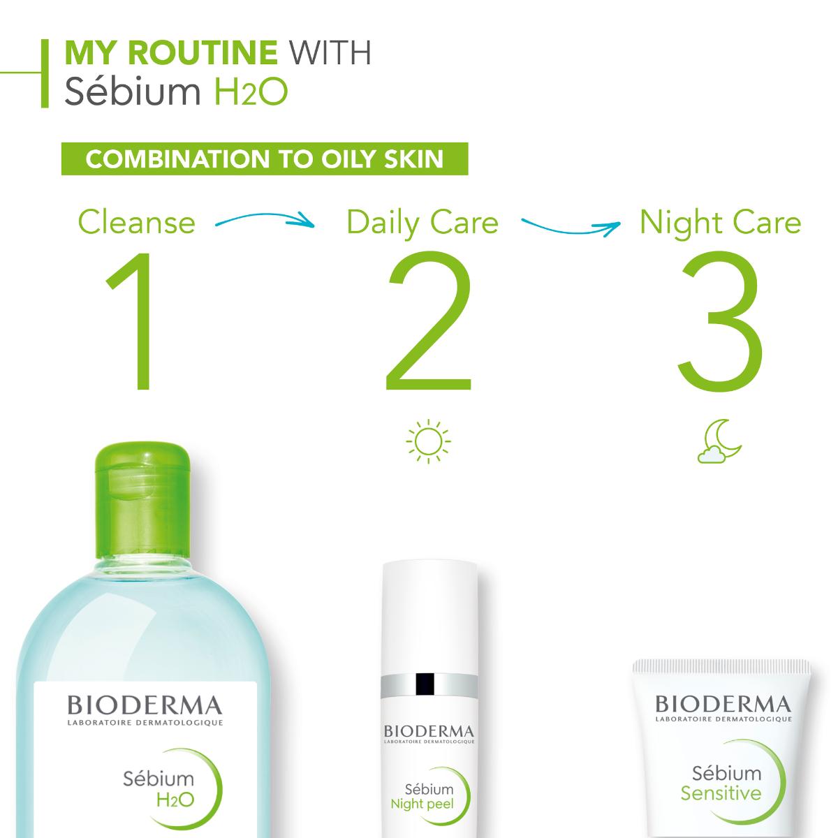 Sébium H2O is a specific make-up removing micellar water for combination to oily skin that mimics the natural composition of the skin for perfect make-up removal and total respect for even the most sensitive skin.