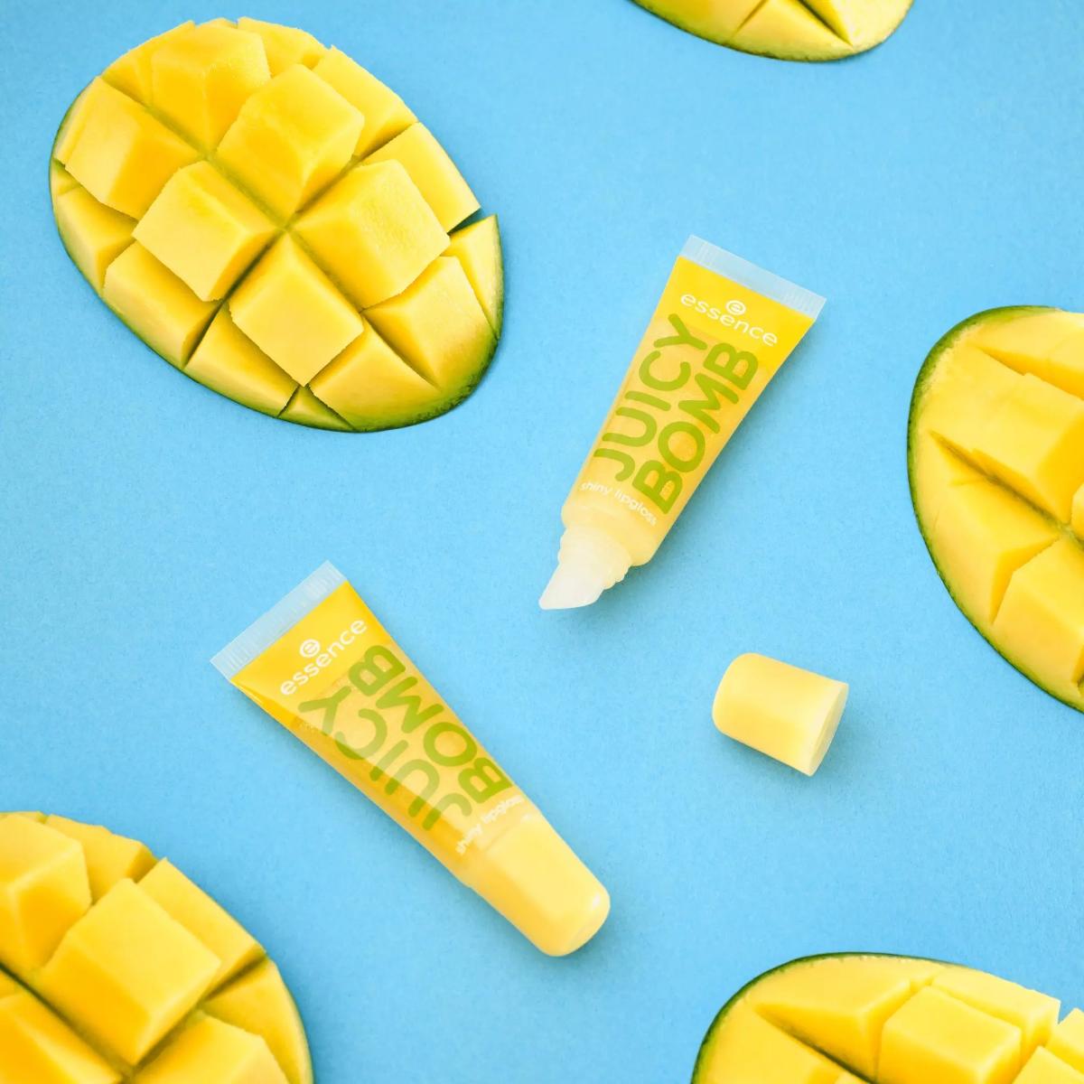 - Using the slanted tip applicator, apply essence Juicy Bomb Shiny Lipgloss to lips.
