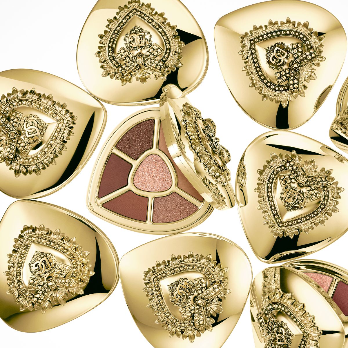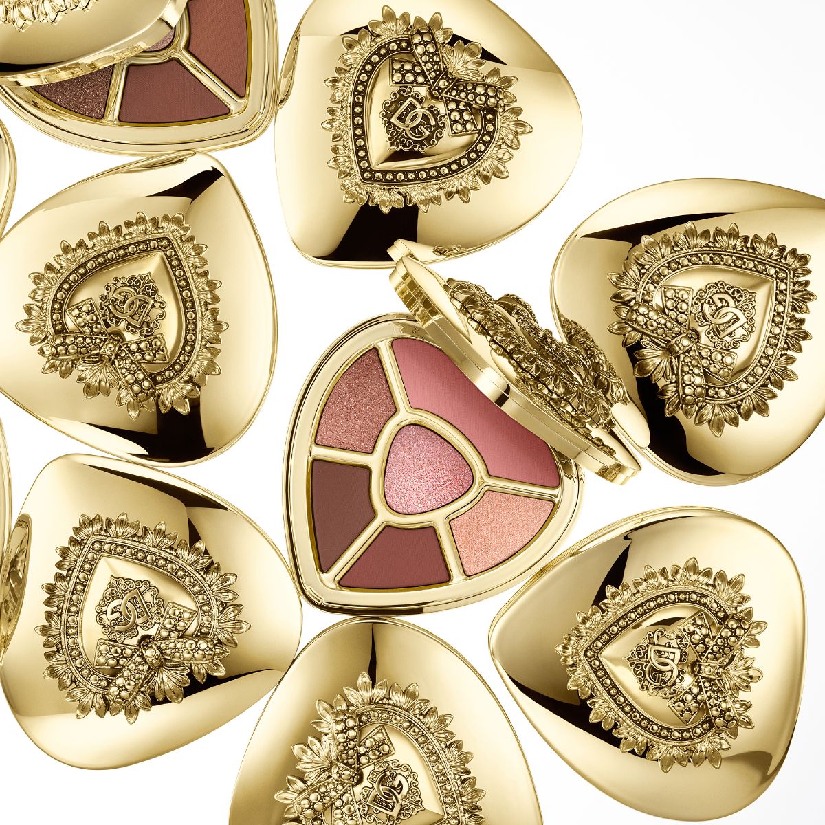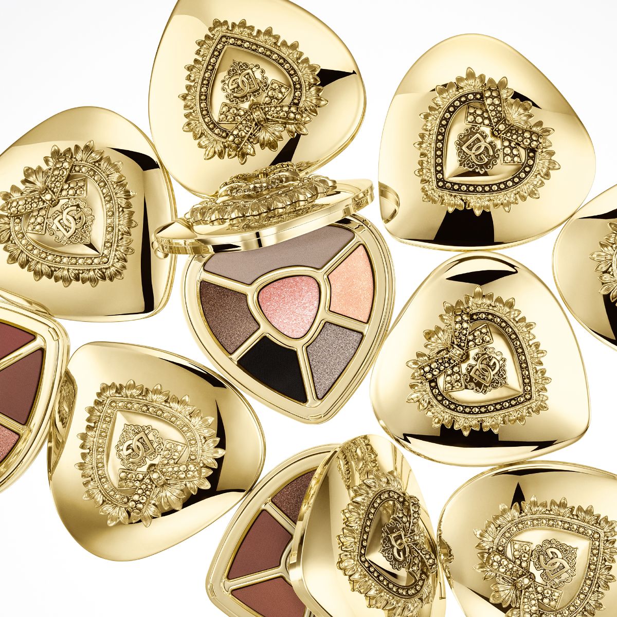 Each palette is housed in a sophisticated gold heart-shaped compact adorned with the iconic Devotion Sacred Heart, including a built-in mirror for effortless application on the go.