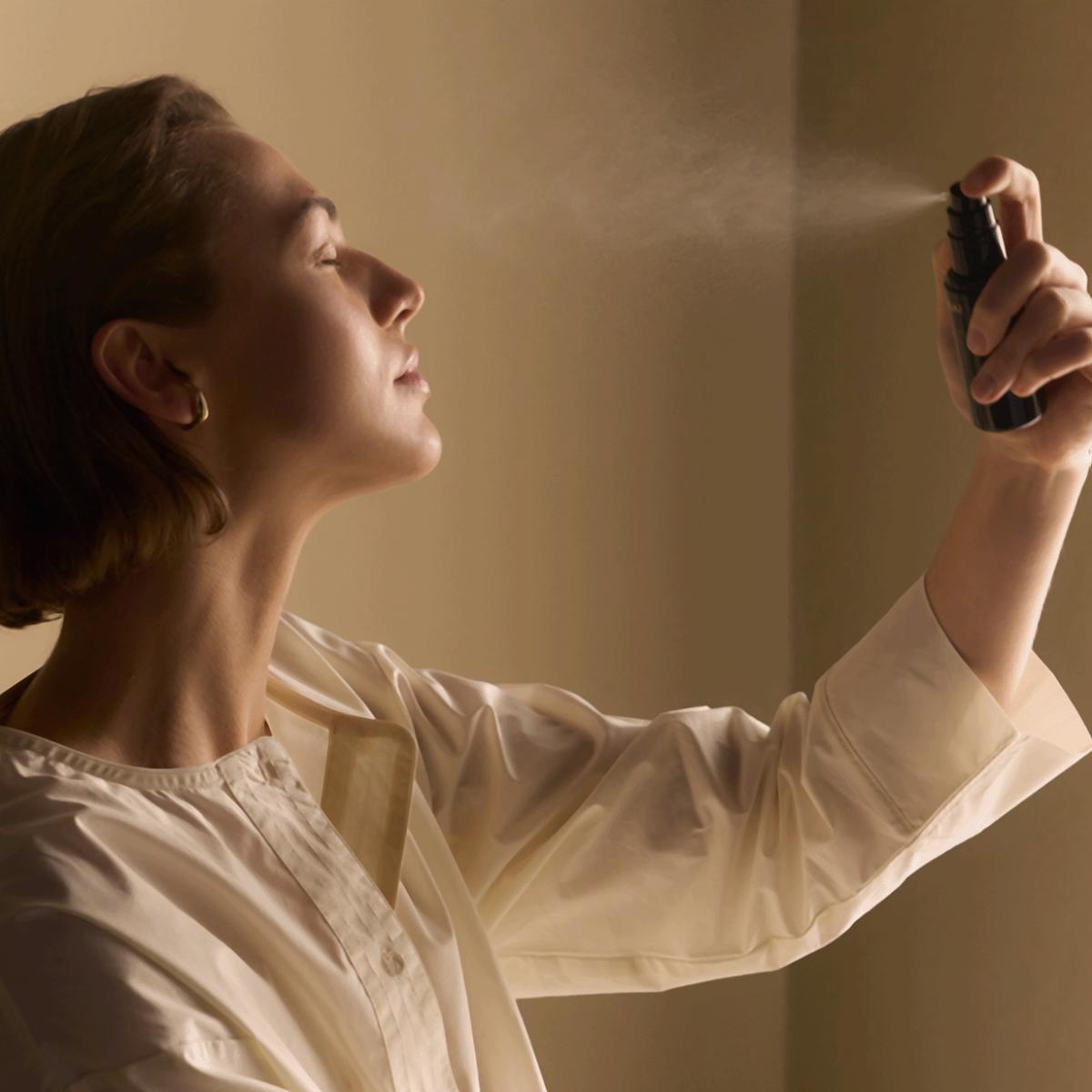 • Create your desired make‑up look, and as a last step in your routine, hold the bottle of HYDRATING FIX MIST about 20cm away from the face, close eyes and mouth, and then spray.