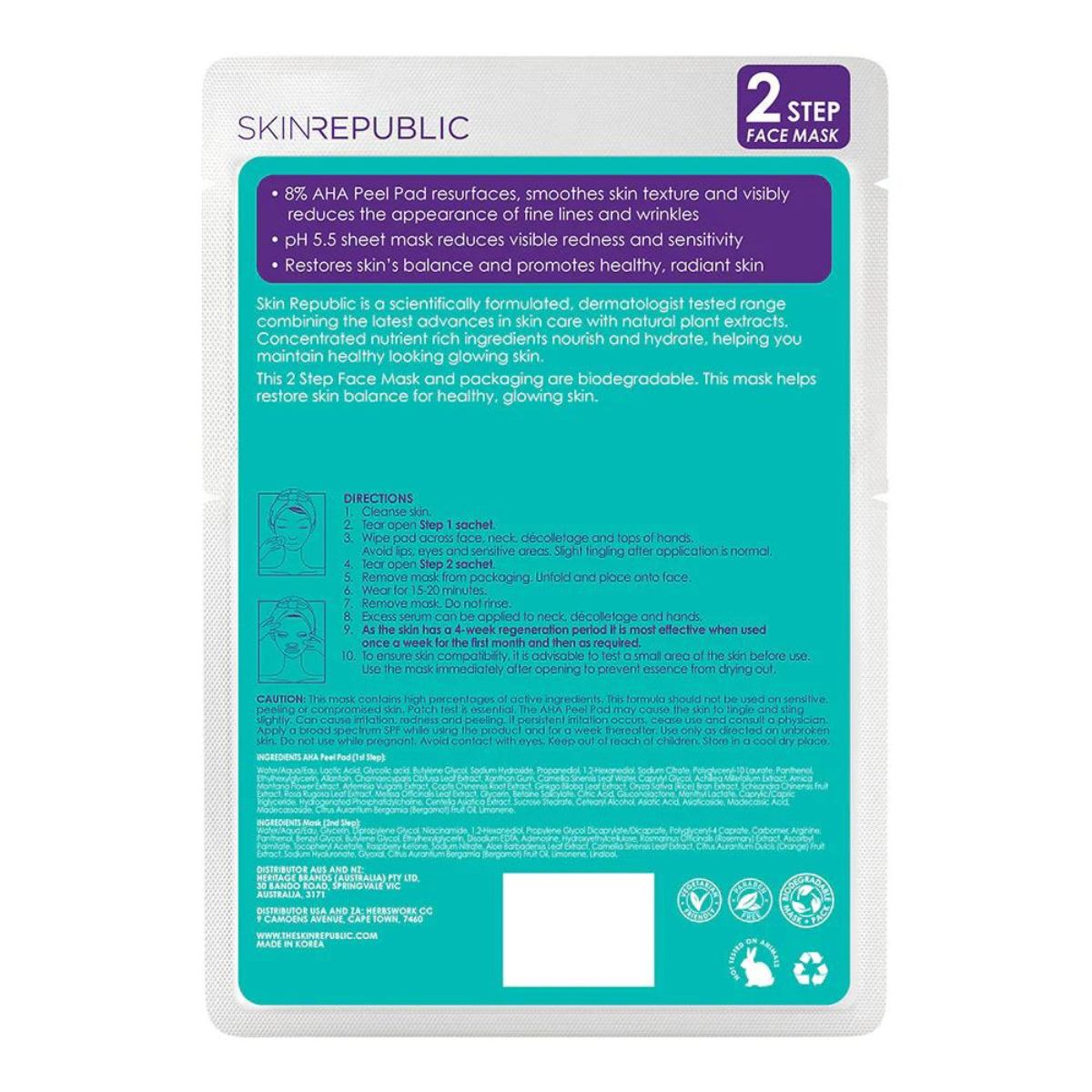 Cleanse skin. Tear open Step1 sachet. Wipe pad across face, neck, décolletage and tops of hands. Avoid lips, eyes and sensitive areas. Slight tingling after application is normal. Tear open Step2 sachet. Remove mask from packaging. Unfold and place onto face. Wear for 15-20 minutes. Remove mask. Do not rinse. Excess serum can be applied to neck, décolletage and hands. As the skin has a 4-week regeneration period it is most effective when used once a week for the first month and then as required. To ensure skin compatibility, it is advisable to test a small area of the skin before