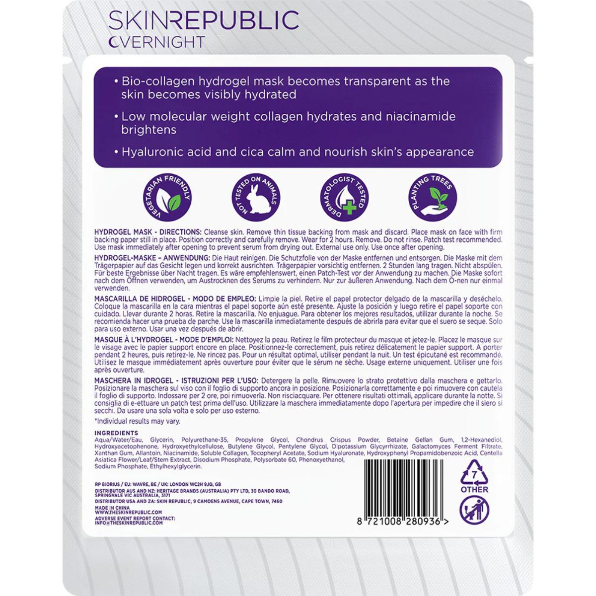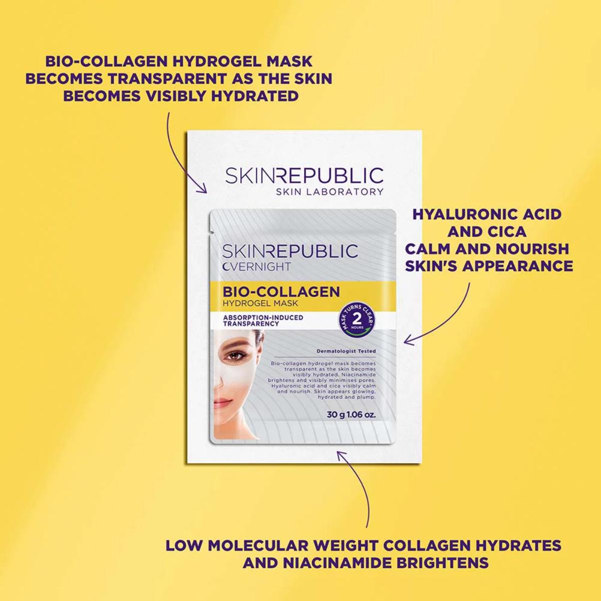 Bio-collagen hydrogel mask becomes transparent as the skin becomes visibly hydrated. Niacinamide brightens and visibly minimises pores. Hyaluronic acid and cica visibly calm and nourish. Skin appears glowing, hydrated and plump.