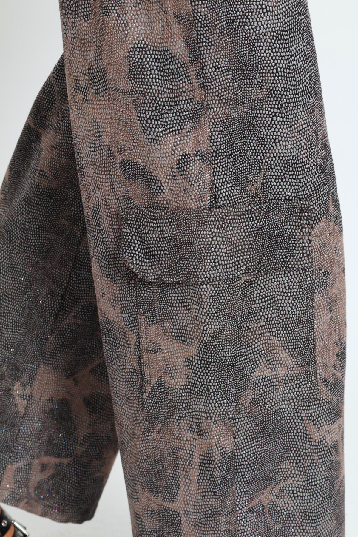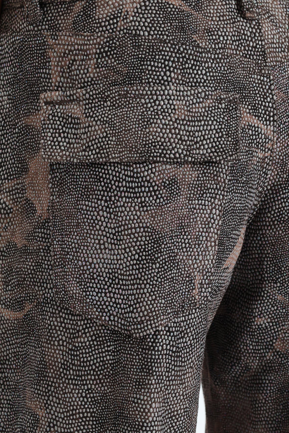 A pair of twill pants featuring allover rhinestone embellishments, a mid-rise waist, belt loops, zip fly and button-front closure, slanted front pockets, wide leg, and leg and back cargo flap pockets.