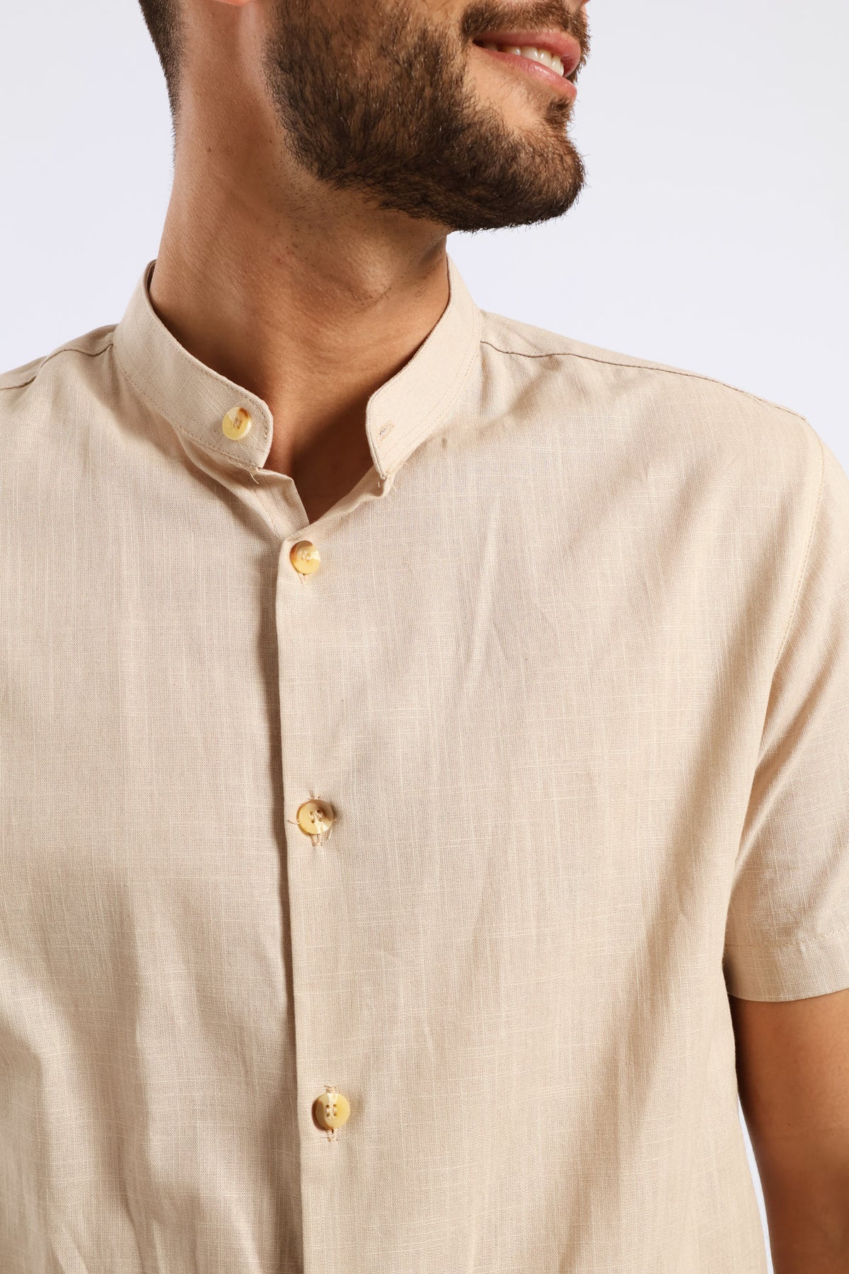 Short Sleeve Slim Linen Look Mandarin Shirt - Stone