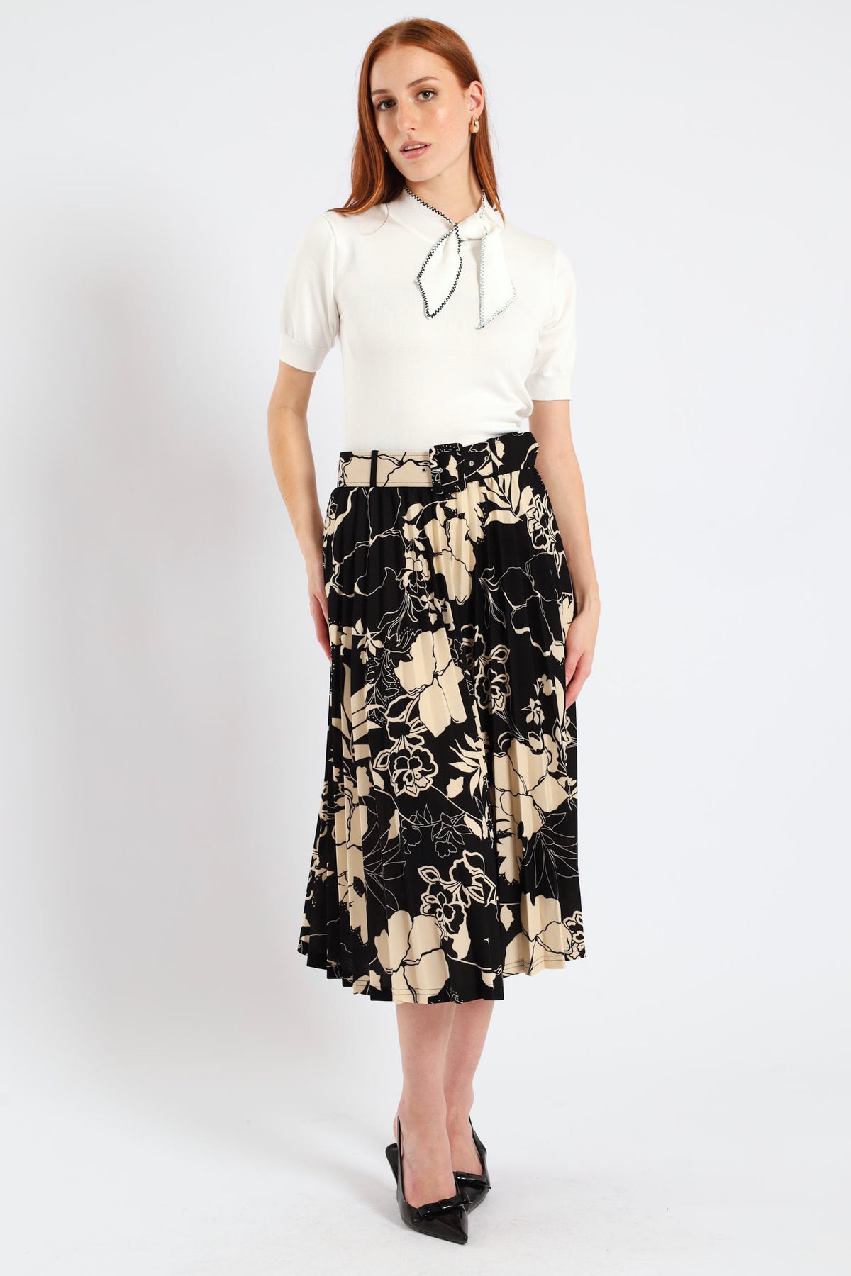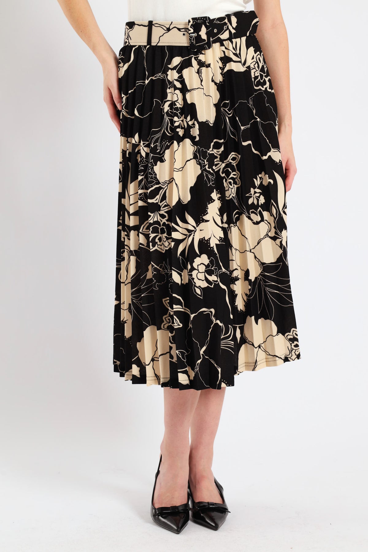 Floral Pleated Midi Skirt - Black/Cream