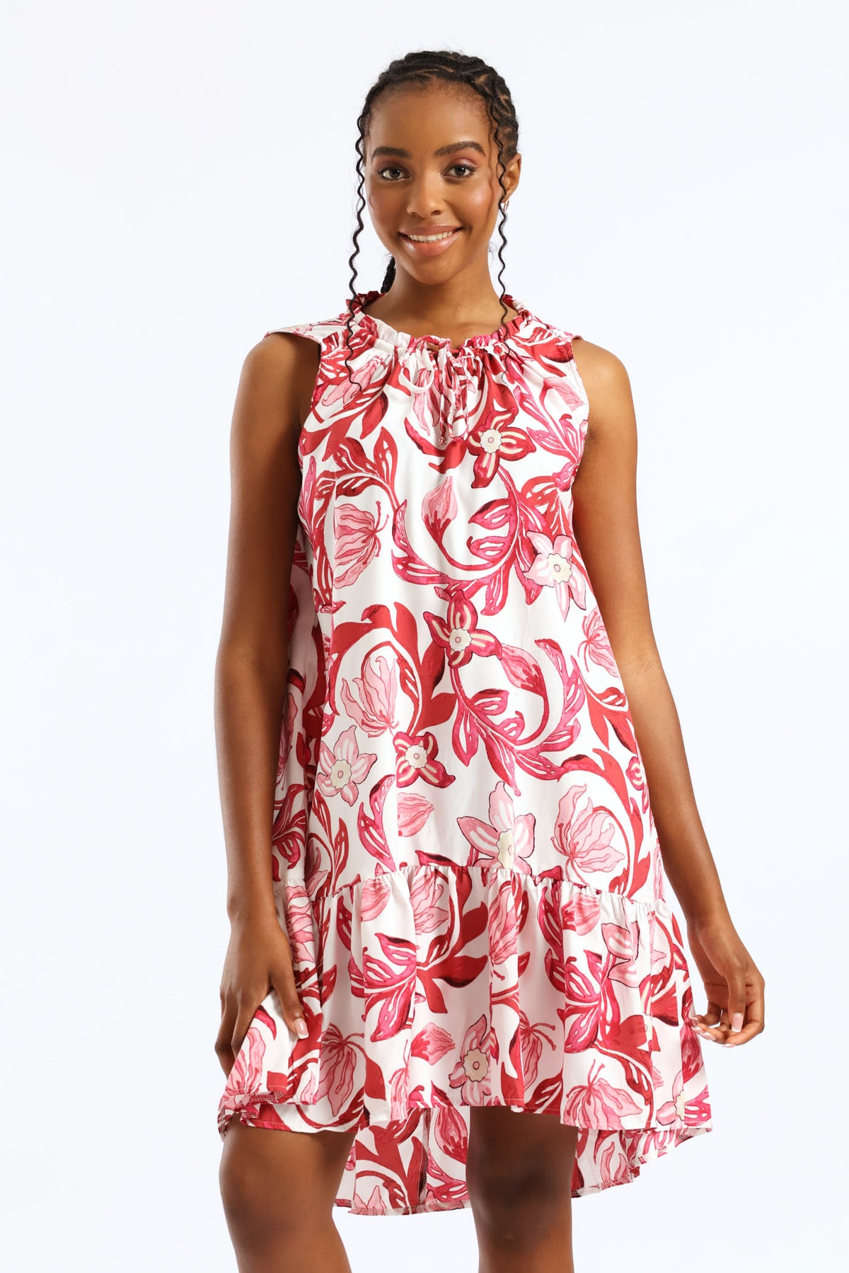 Frill Neck Printed Drop Hem Dress - White/Pink