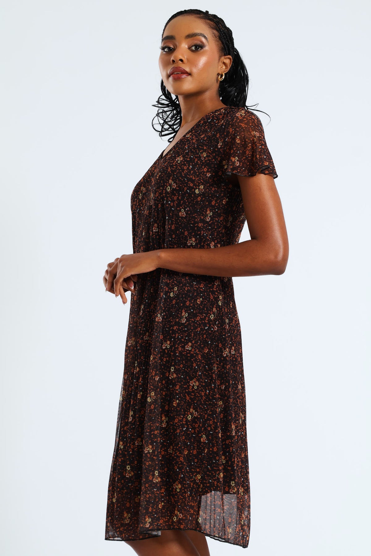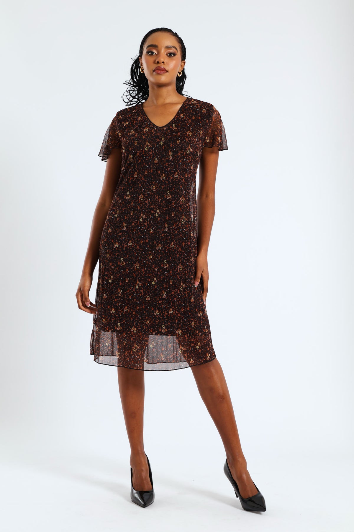 V-Neck Release Pleat Mesh Midi Dress - Black/Orange