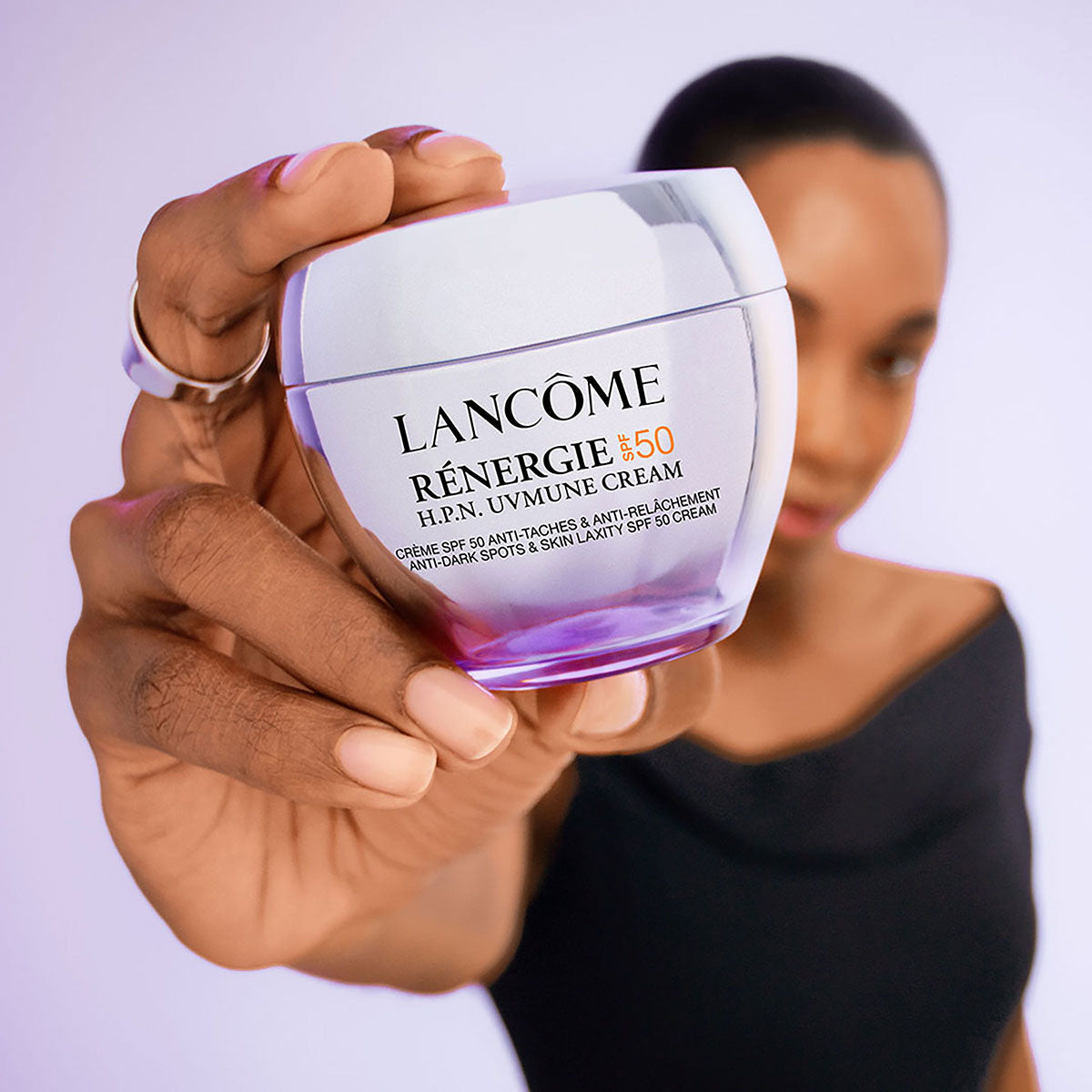 Our innovation in SPF texture and finish, Rénergie H.P.N. UVMUNE SPF50 Cream feels silky and velvety to the touch, leaving skin soft and luminous, with no greasiness or white cast.