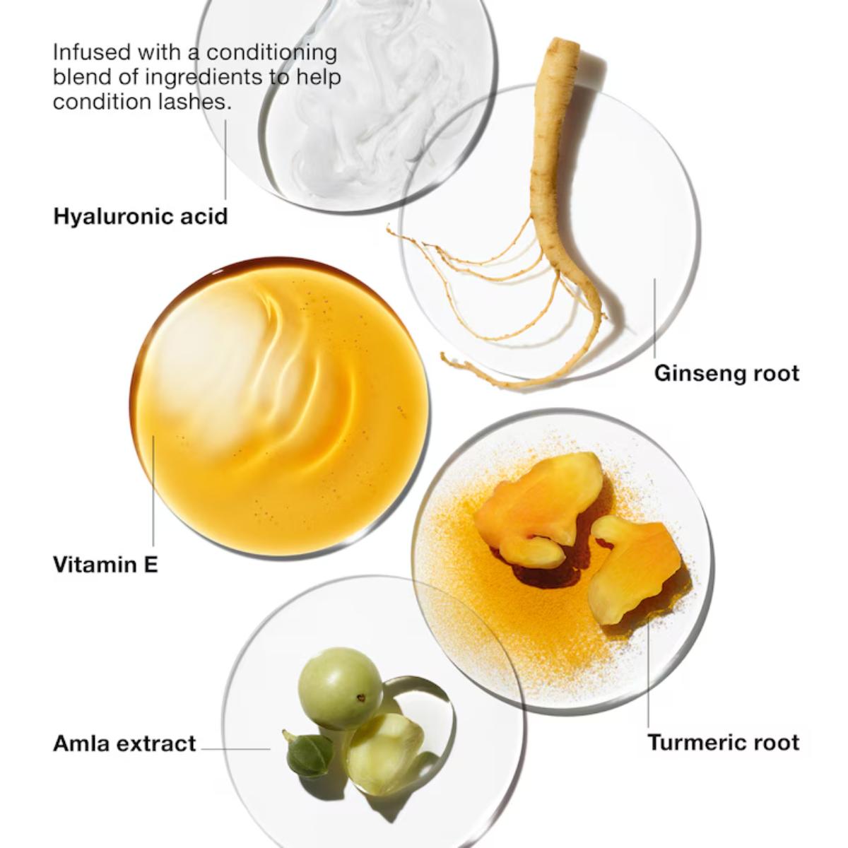 - Conditioning blend, including hyaluronic acid, vitamin E, ginseng root, turmeric root, and alma extract, help condition lashes.