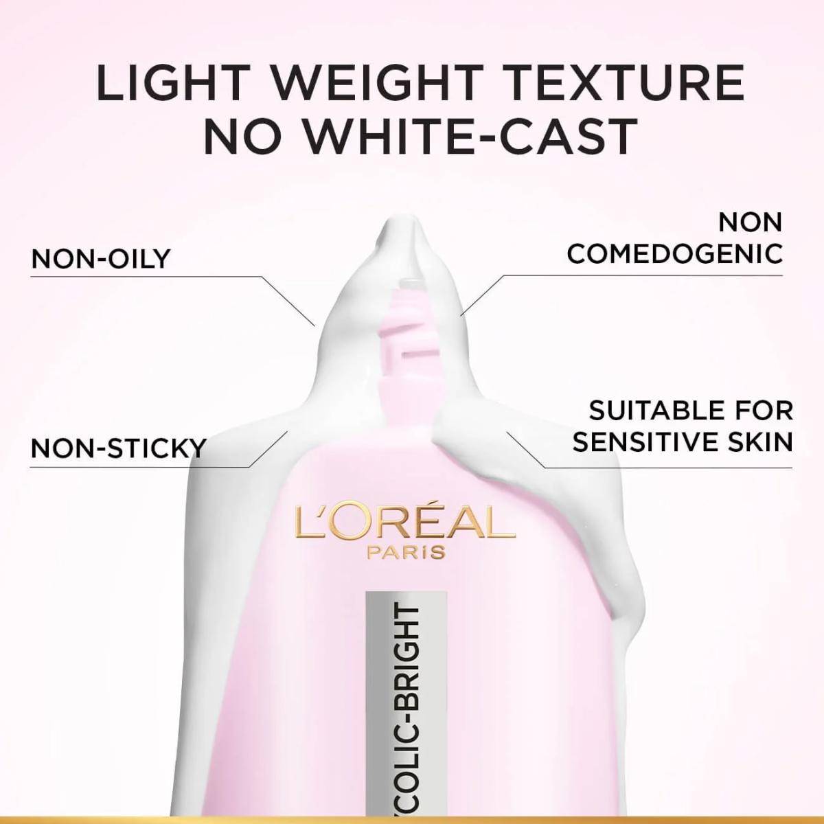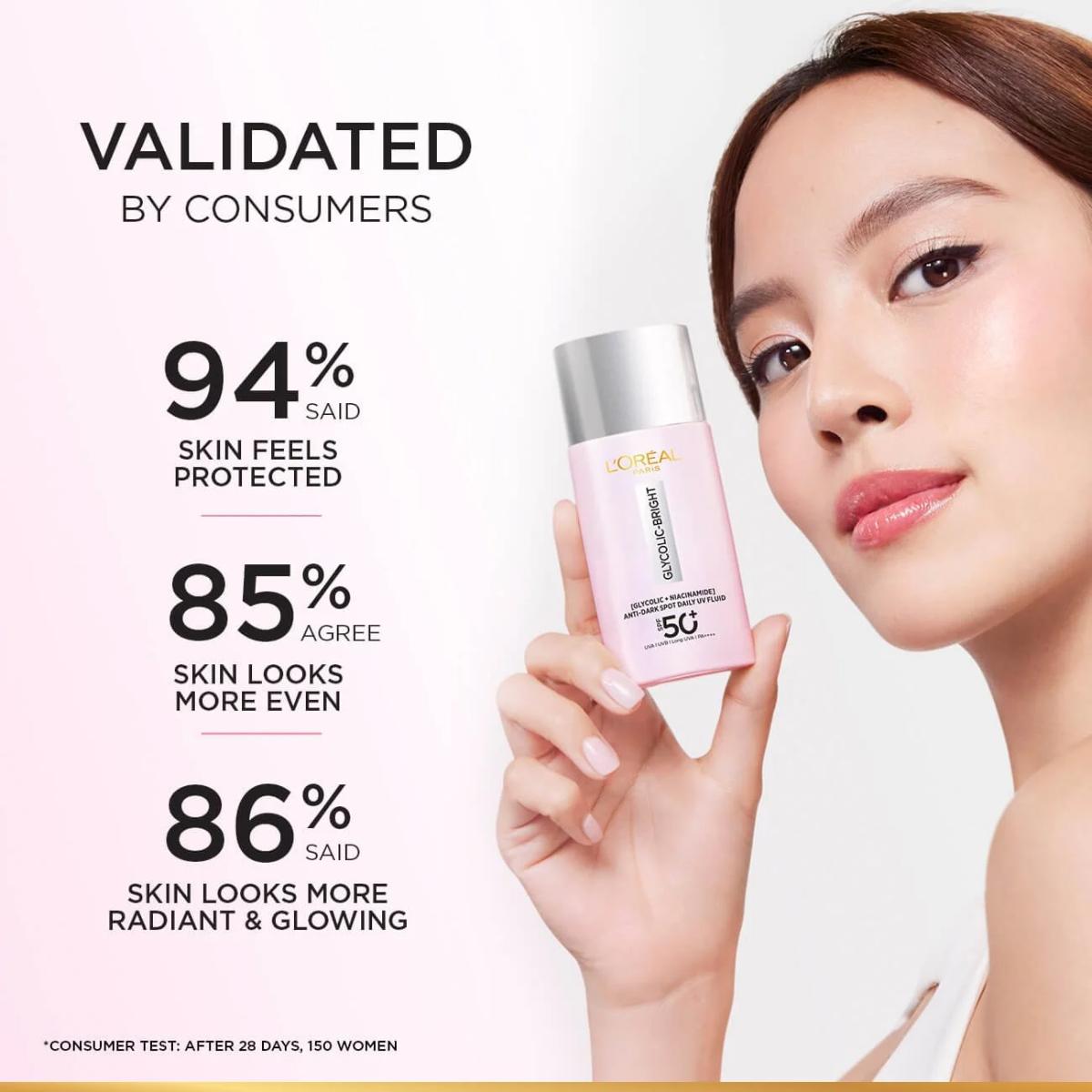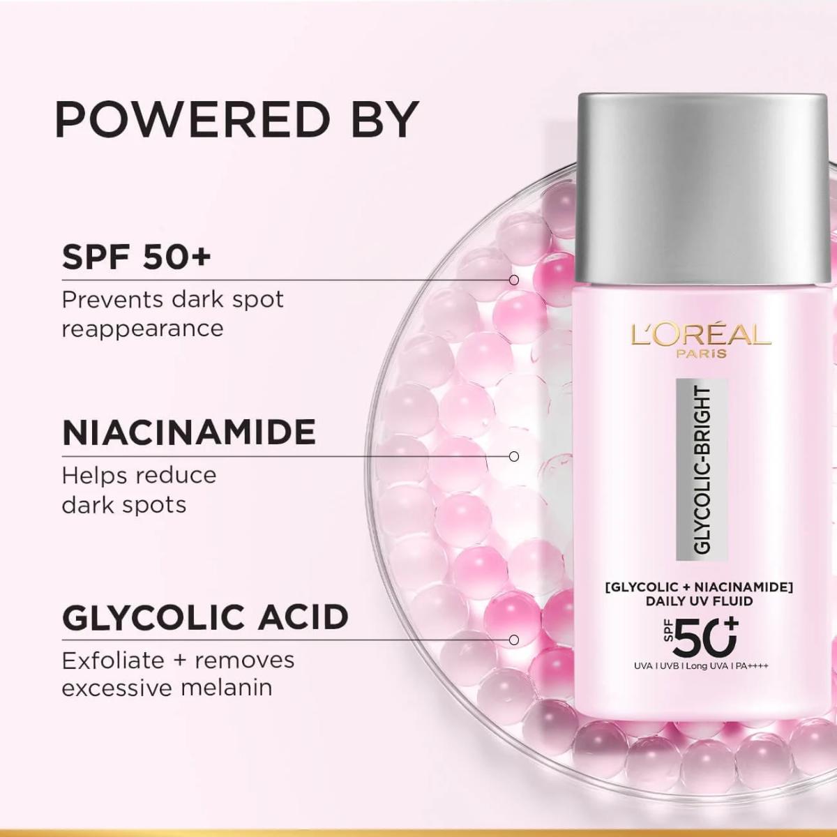 With 35 years of tone management expertise, L'Oréal Skincare Laboratories developed GLYCOLIC BRIGHT ANTI DARK SPOT DAILY UV FLUID SPF 50+, your daily dose of radiance and protection. Formulated with a powerful blend of Glycolic Acid and Niacinamide, this lightweight fluid instantly shields your skin from harmful UV rays to prevent the formation of all types of dark spots.