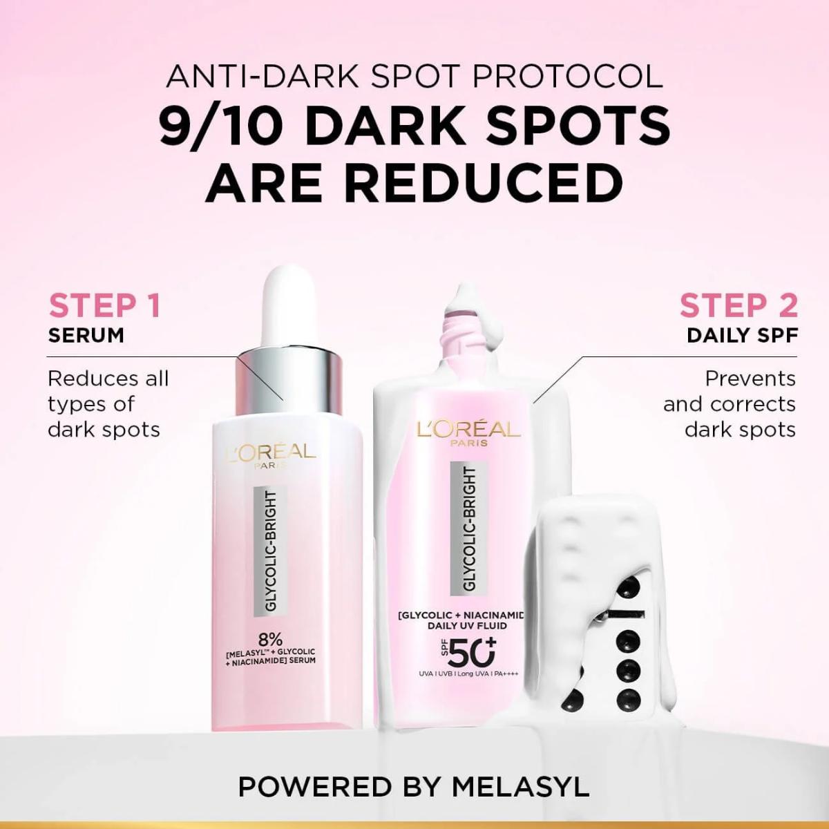 - Step 6: Protect your skin with GLYCOLIC-BRIGHT ANTI DARK SPOTS DAILY UV FLUID SPF 50+ for an instant boost of radiance and lasting protection against future dark spots. For the best application, shake the UV fluid well and gently apply on your face and neck after moisturizer.