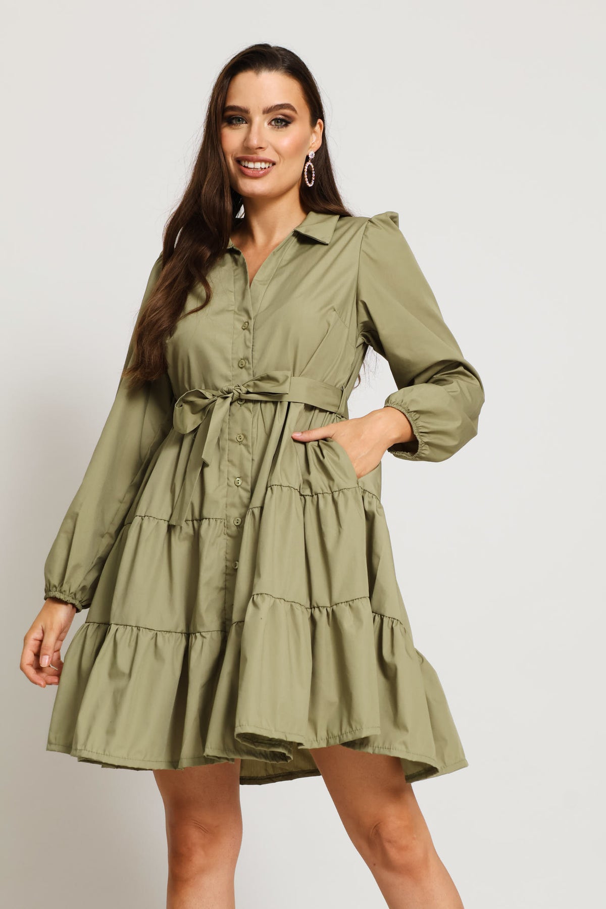 Long Sleeve Collared Tiered Shirt Dress
