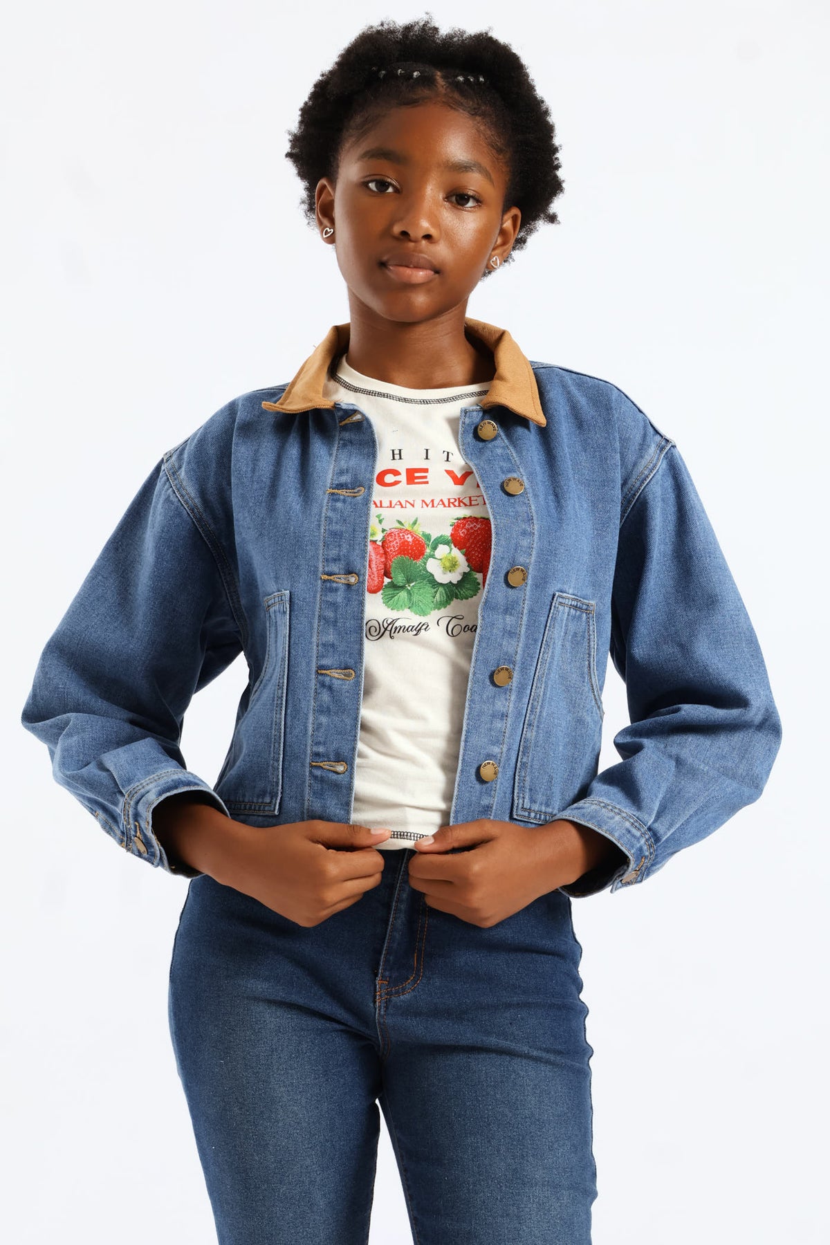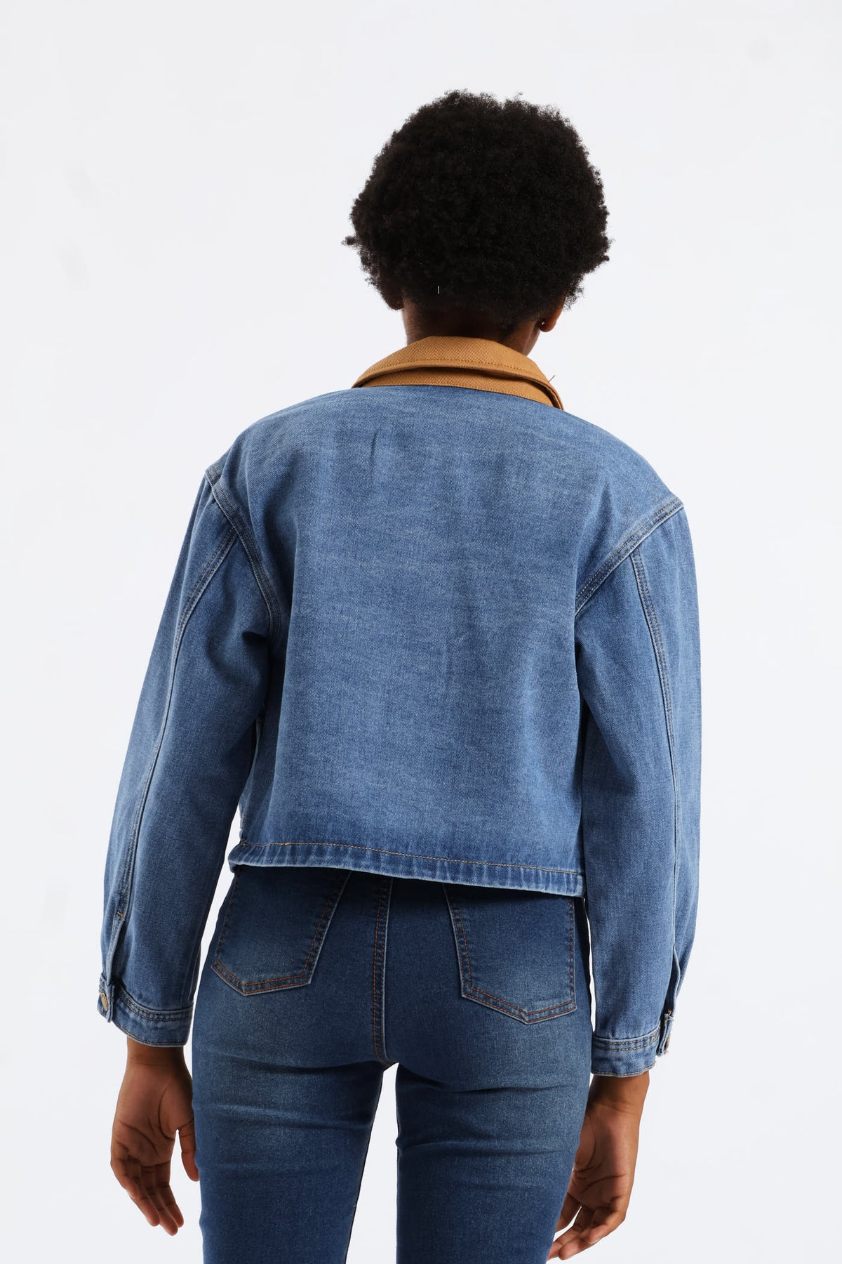 Girls Twill Contrast Collar Denim Jacket - Mid Blue