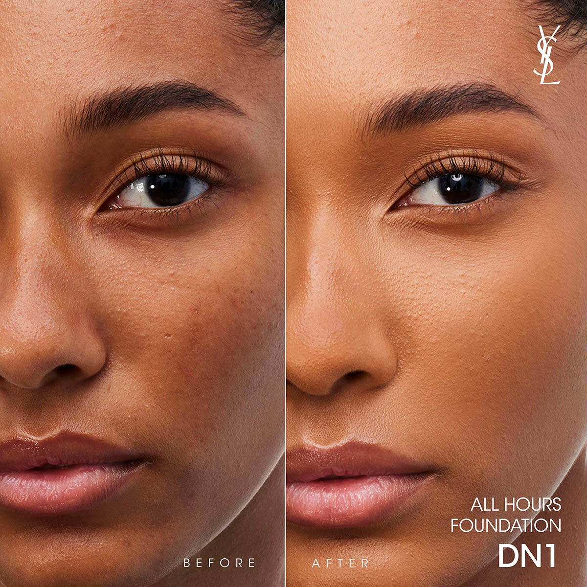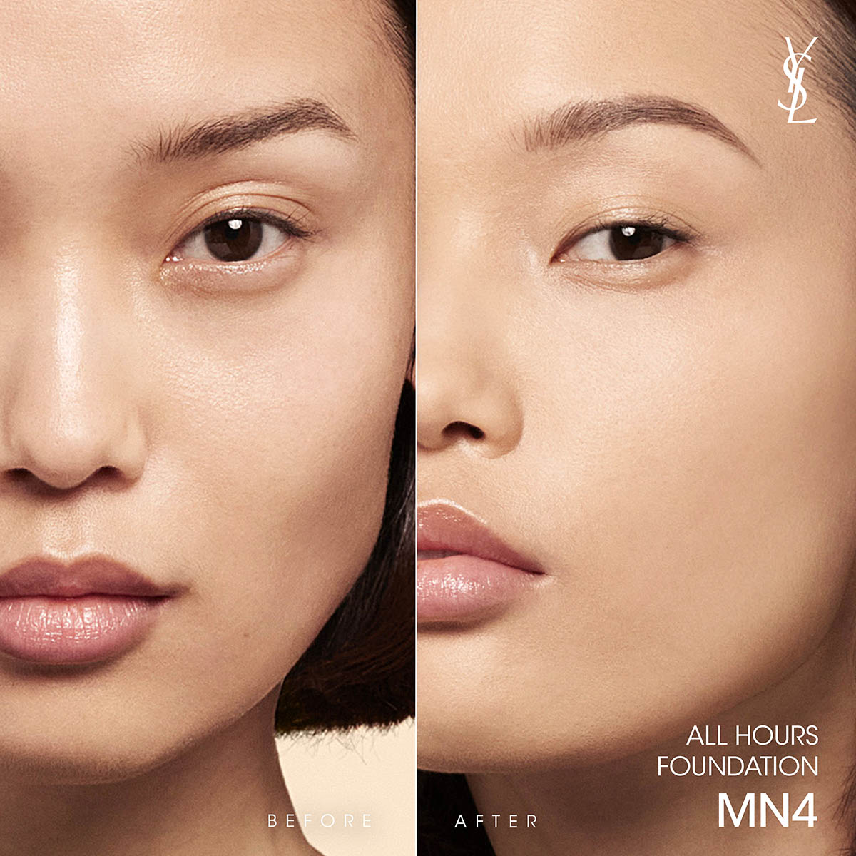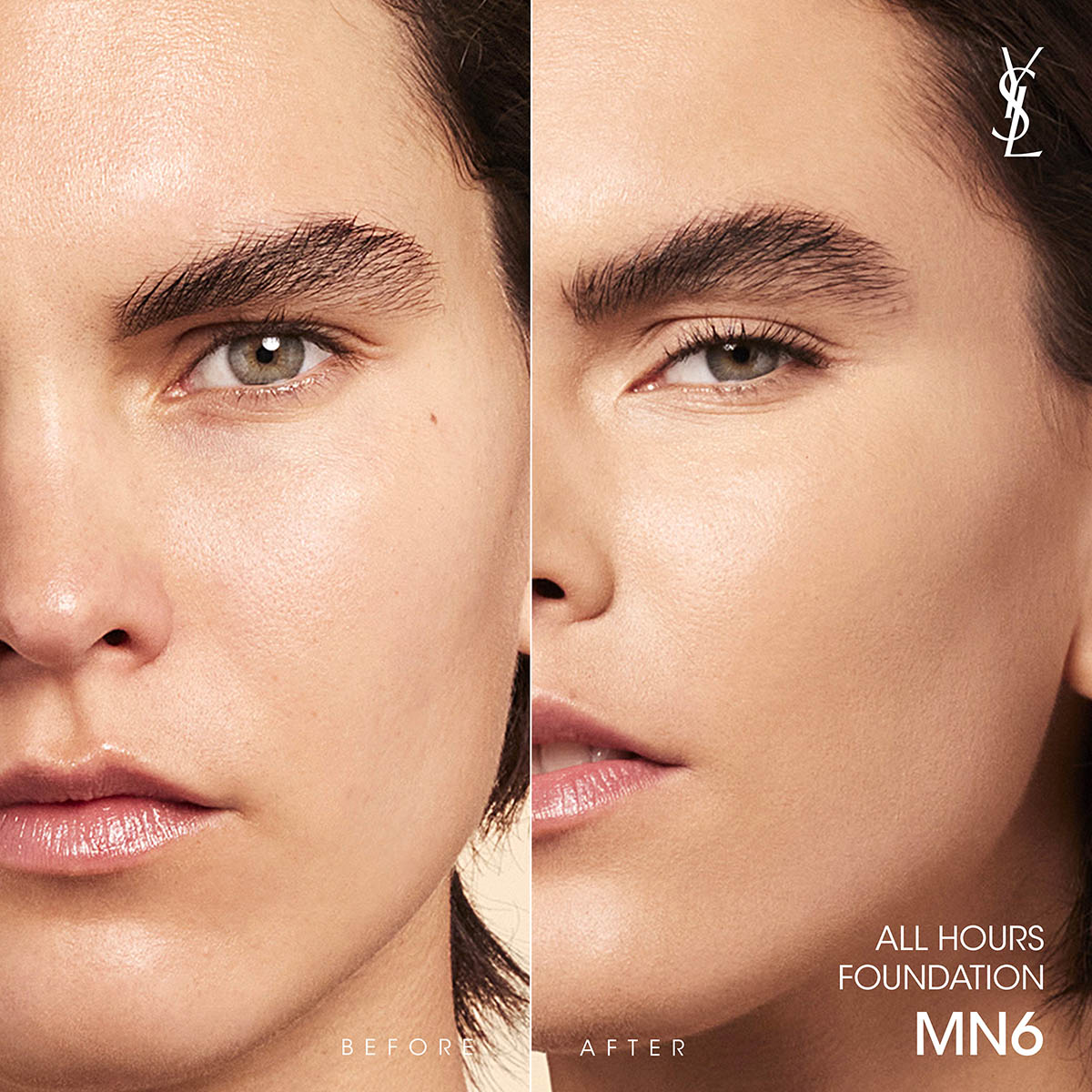 All Hours Foundation features a lightweight formula with 77% skincare base and high levels of hyper pigments, providing a weightless feel and high coverage that lasts 24 hours. It evens out the complexion with a satin-matte finish that feels undetectable on the skin.