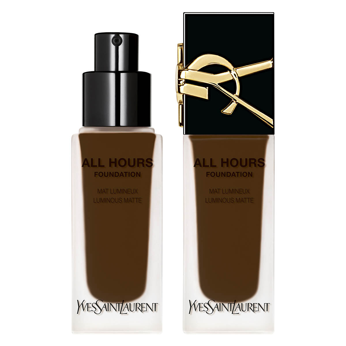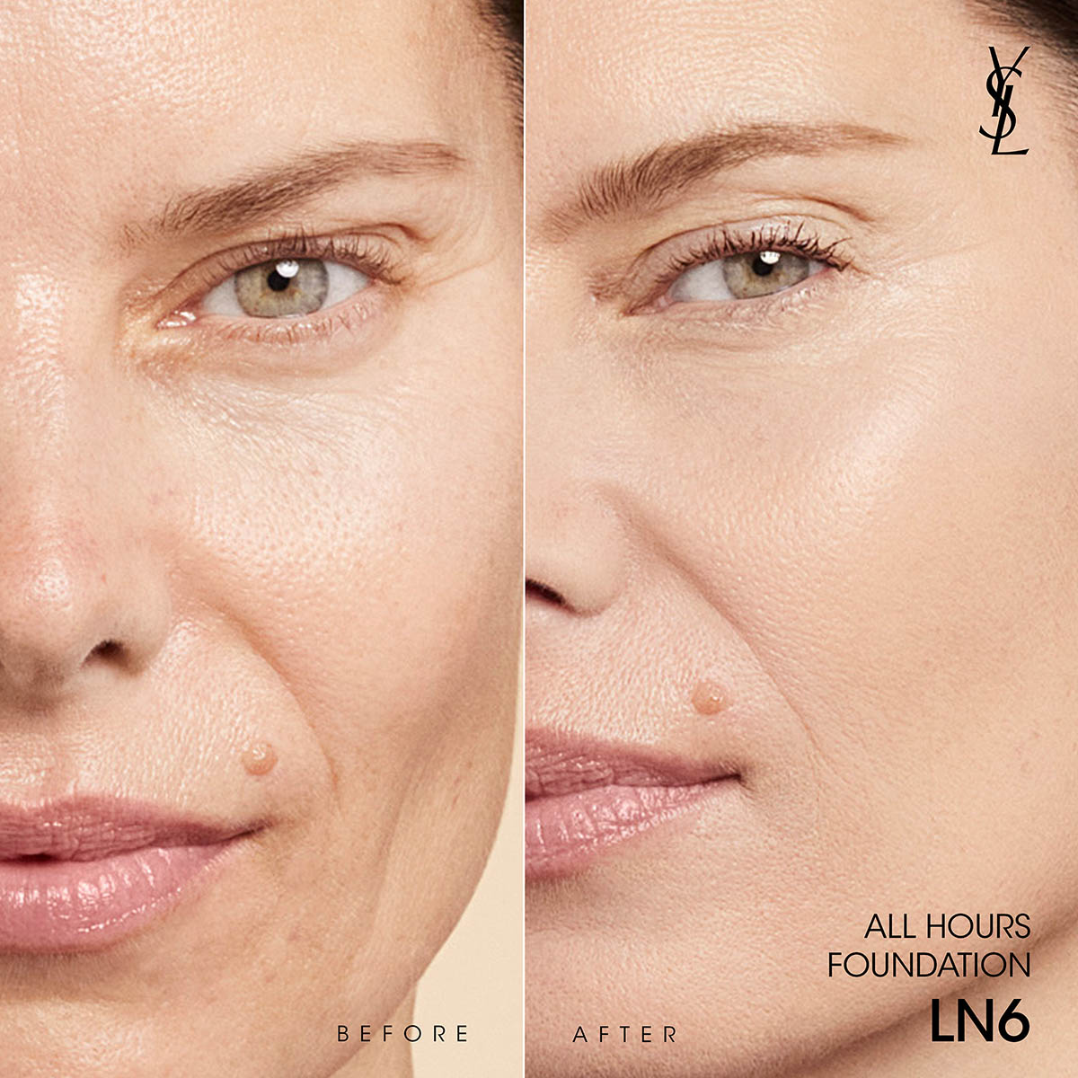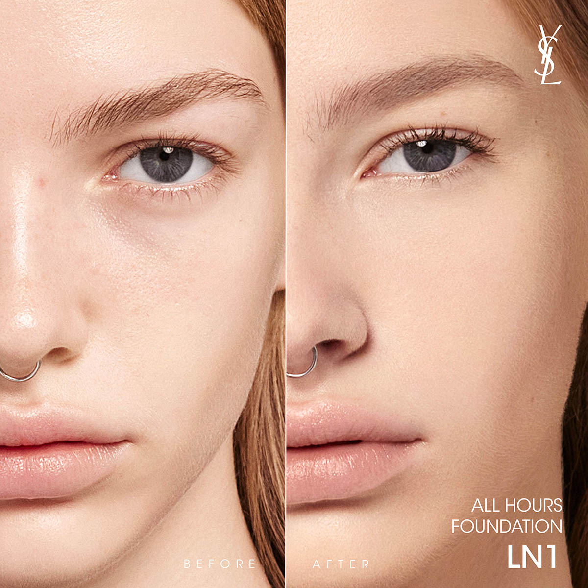All Hours Foundation features a lightweight formula with 77% skincare base and high levels of hyper pigments, providing a weightless feel and high coverage that lasts 24 hours. It evens out the complexion with a satin-matte finish that feels undetectable on the skin.
