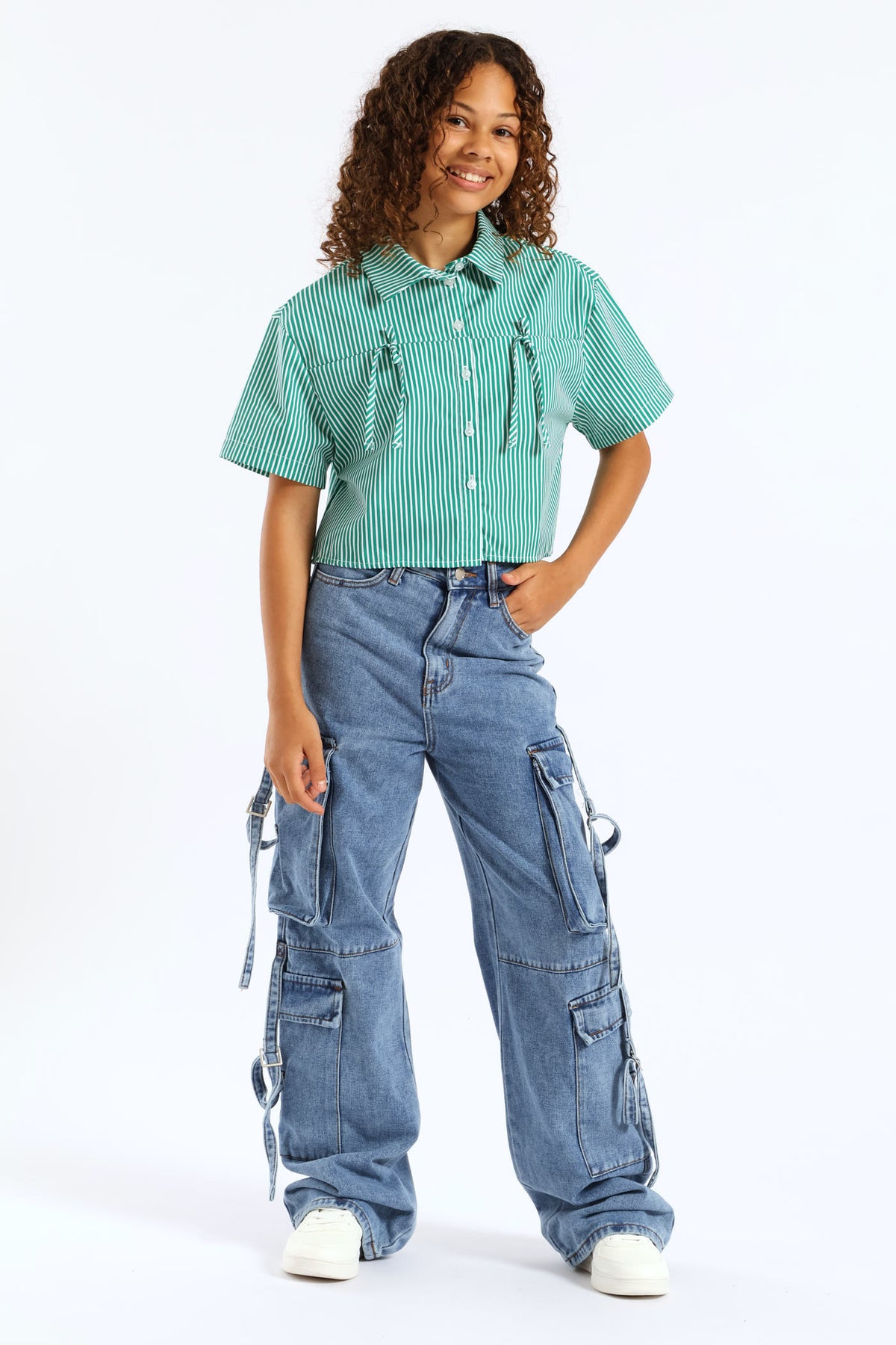 Girls Stripe Poplin Bow Detail Shirt - Green