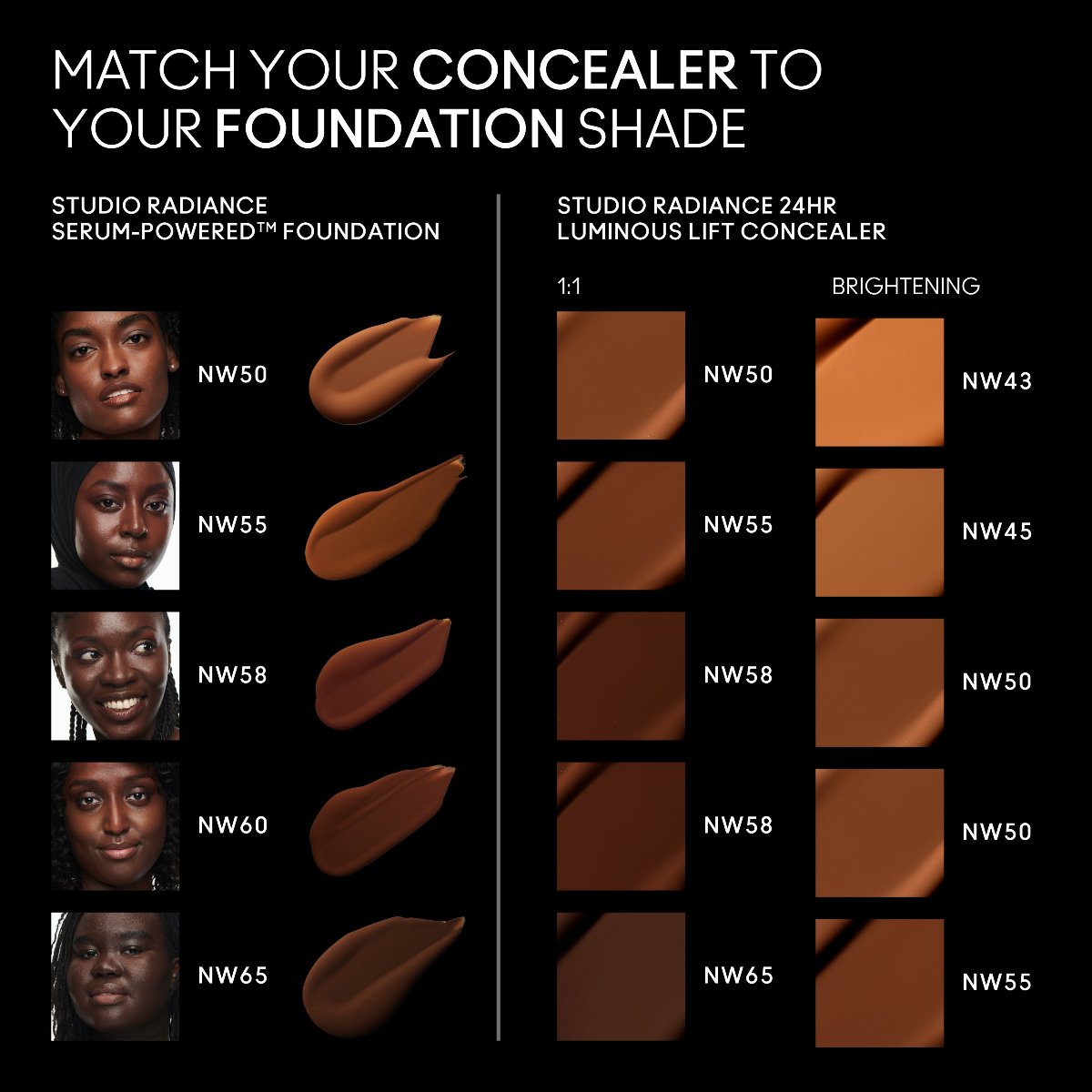 Studio Radiance 24HR Luminous Lift Concealer features an Artist-Curated Radiance Blend, made from silver and gold pearlescent particles specifically crafted to complement unique undertones of light and rich skin. It’s available in 44 radiant shades to match your Studio Radiance Serum-PoweredTM Foundation.