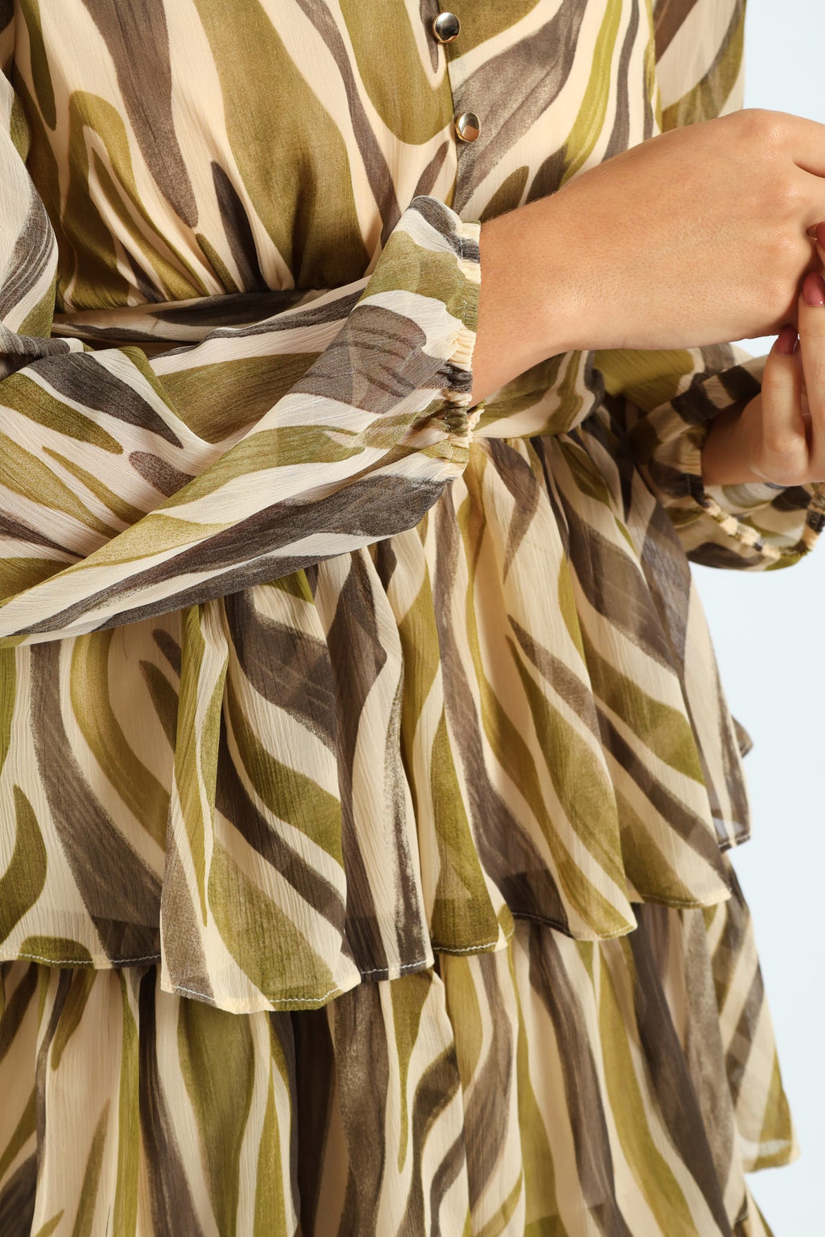 V-Neck Elasticated Waist Tiered Tea Dress - Green
