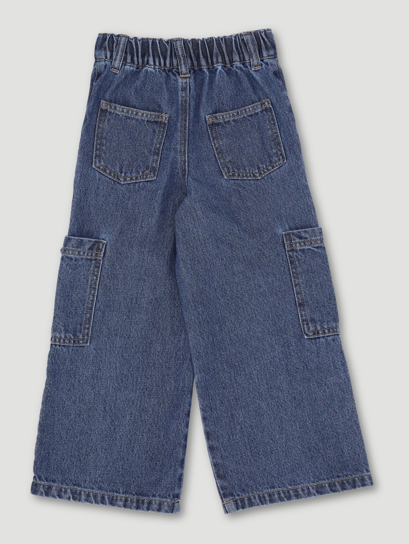 Pre-Girls Bow Cargo Wideleg Denim - Mid Blue