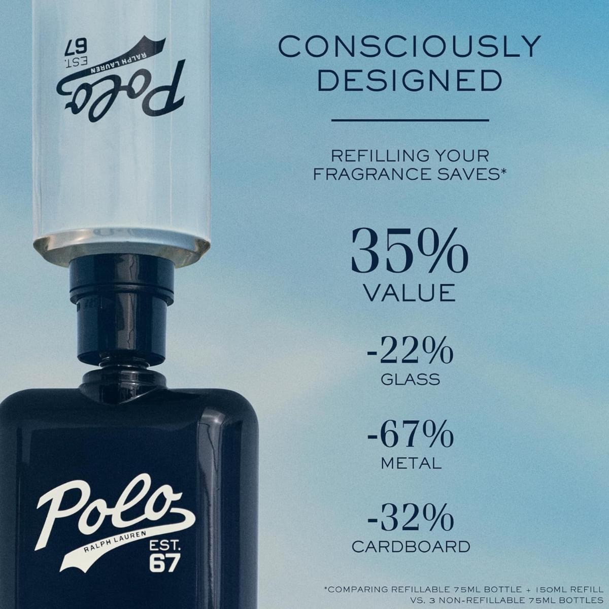 The iconic Polo branding is reimagined with a modified logo that pays homage to the history of Polo. A luxurious dark blue bottle accented with a vintage white Polo 67 logo and topped with a metallic blue cap. The bottle was consciously designed to be refillable. Add a personal touch to the bottle in our custom shop by adding an engraved message.