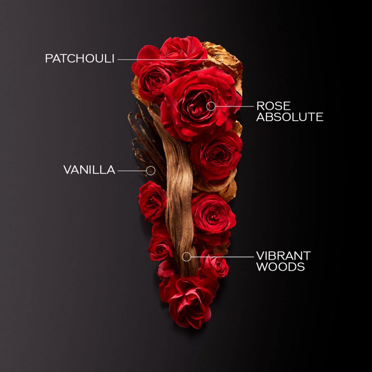 The fragrance opens with the fruity notes of blackcurrant leaves before revealing a sensual and intoxicating floral heart celebrating rose absolute, a  carnal and iconic flower. The irresistible warmth of the vanilla base note melts into the intensity of patchouli. A sensual red floral bouquet sharpened by vibrant woods. The perfect balance between strength and sensuality.