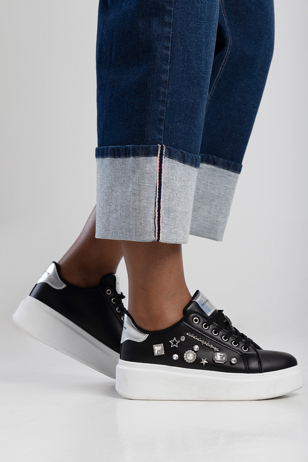 Embrodiered High Waist Turn Up Wide Leg Denim - Dark Wash