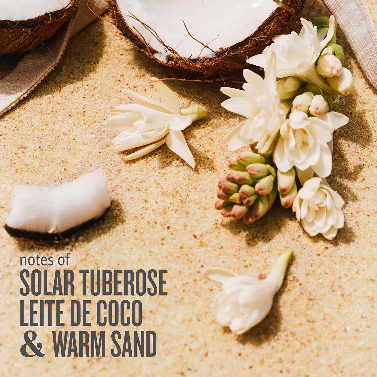 Beachy and nostalgic, this transportive fragrance opens with a burst of leite de coco (coconut milk), while a canopy of solar tuberose and creamy vanilla lingers over warm sand.
