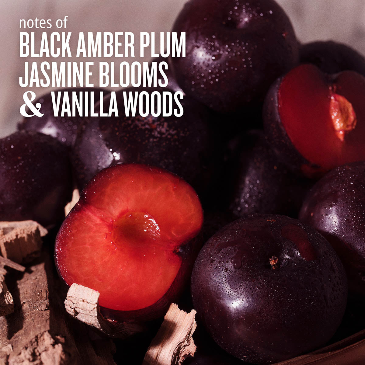 Sultry and delicate, this alluring fragrance opens with rich Black Amber plum, while a veil of jasmine blooms and vanilla woods intertwine with warm musk.