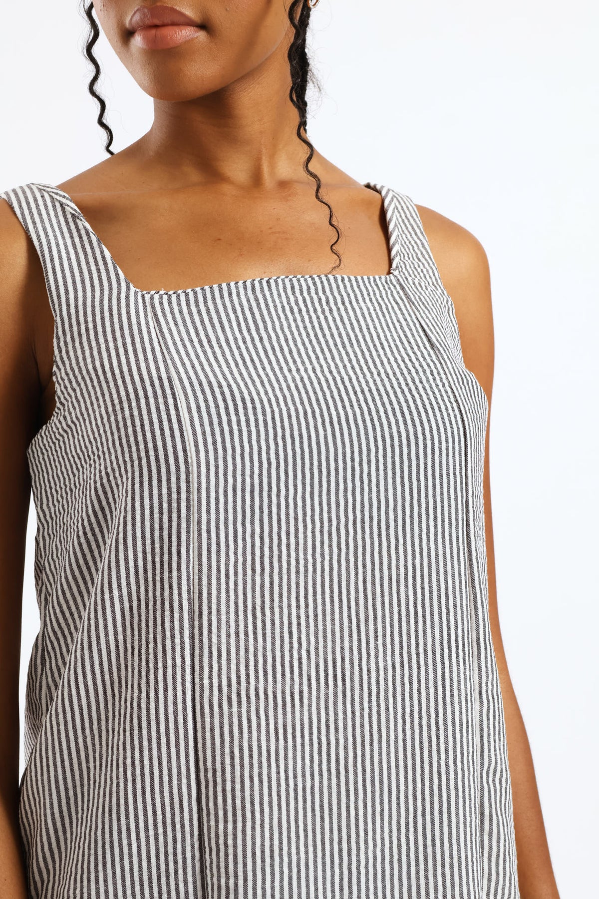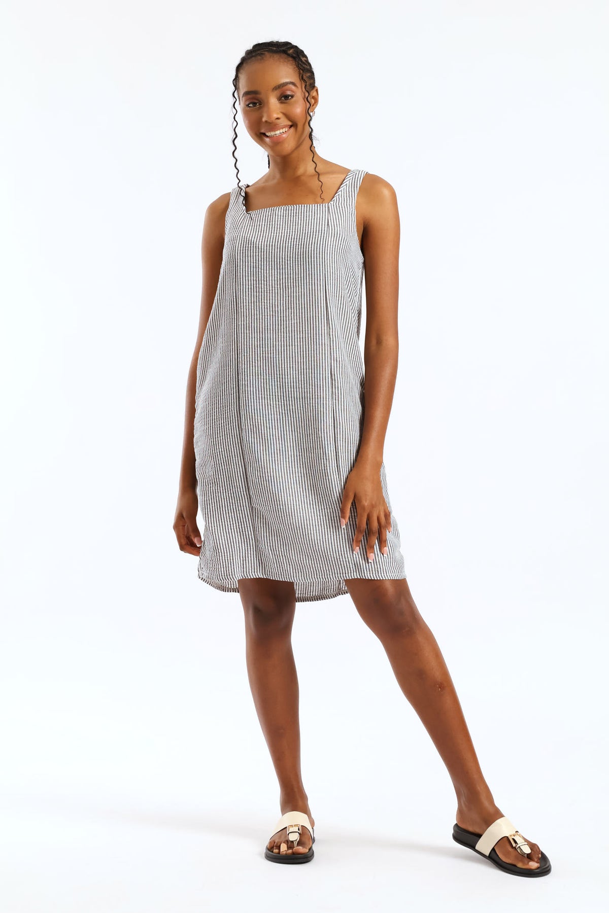 Square Neck Linen Stripe Pinni Mini Dress - Black/White