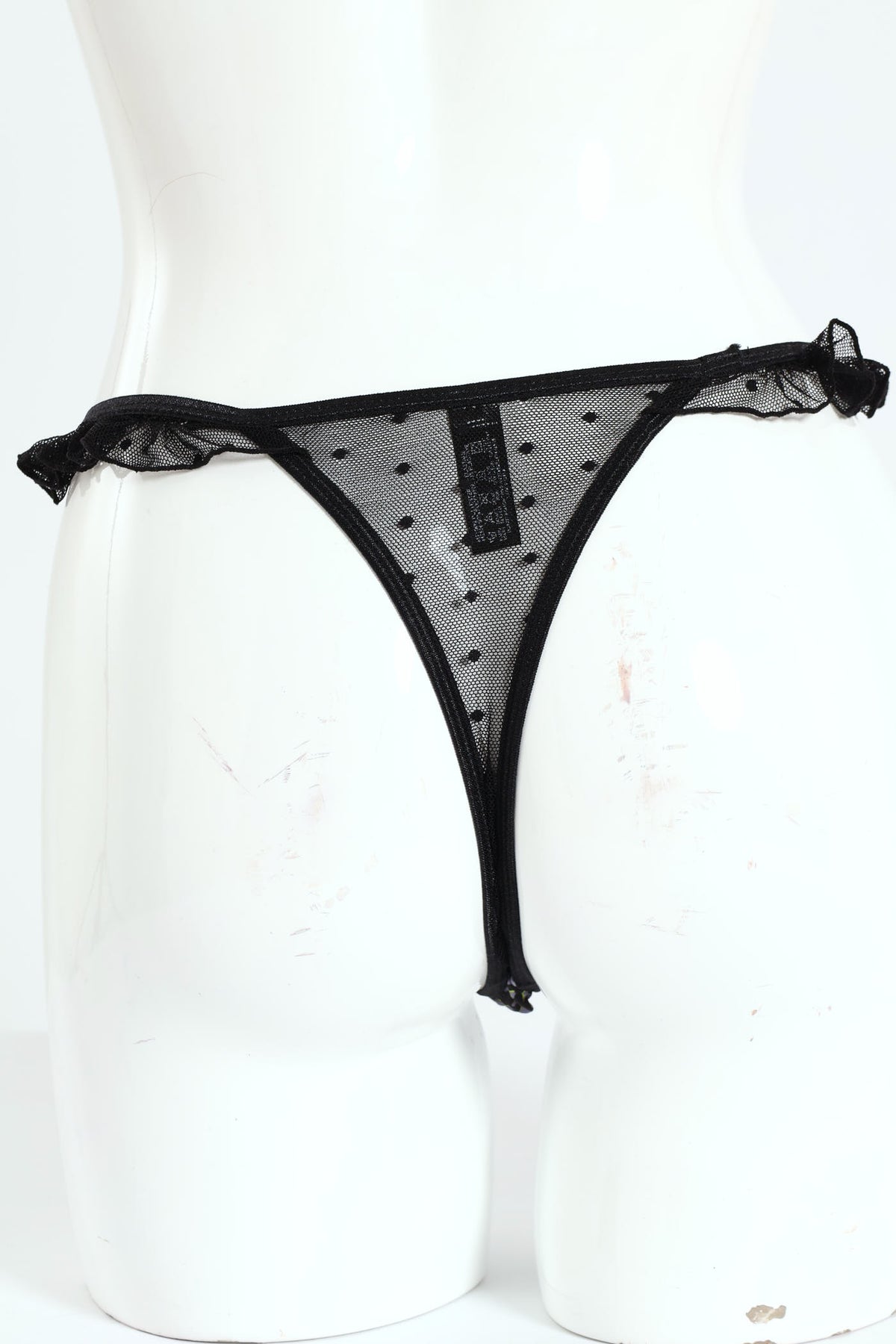 Spot Printed Microfibre & Lace Thong Panty - Black