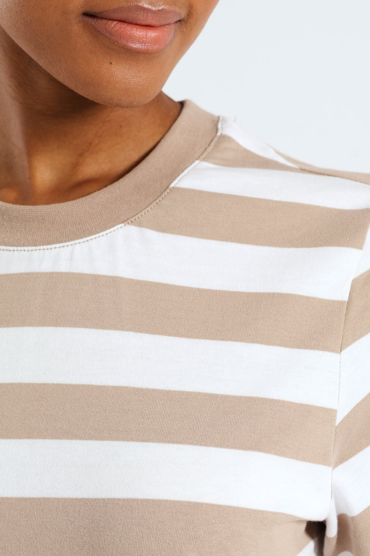 Plain Rib Neck Bold Stripe Boxy Tee - White/Mocha