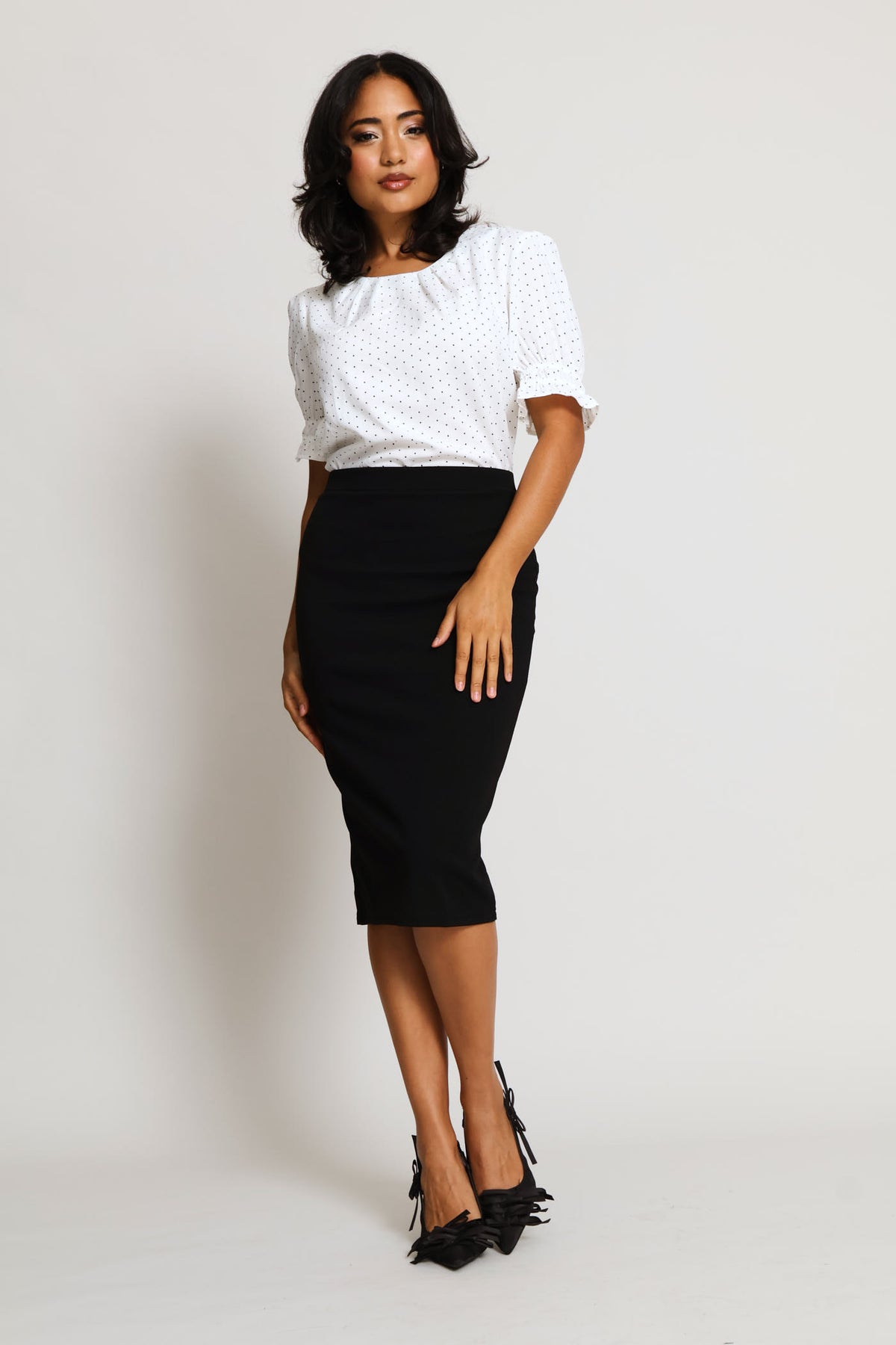 Pleat Neck Spot Puff Sleeve Blouse - Cream/Black