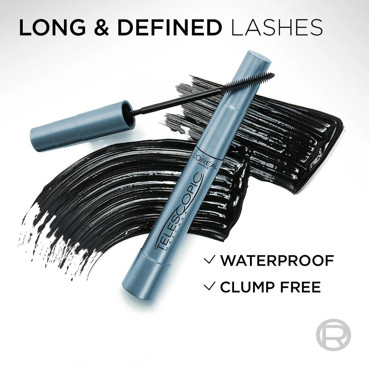 L’Oréal Paris' Telescopic Mascara is an extreme length mascara that provides up to 70% longer looking lashes* and intensity lash by lash. The unique wand combs and separates each lash for a clump-free application. The result is lashes that are longer, fuller, and more defined. Telescopic Mascara is also hypoallergenic, making it ideal for those with sensitive eyes. Achieve a defined eye look with this Black Telescopic Mascara.