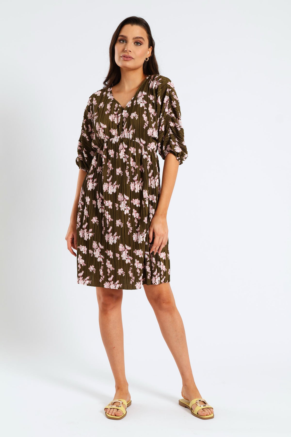 Bubble Sleeve Back Tie Plisse Babydoll Mini Dress