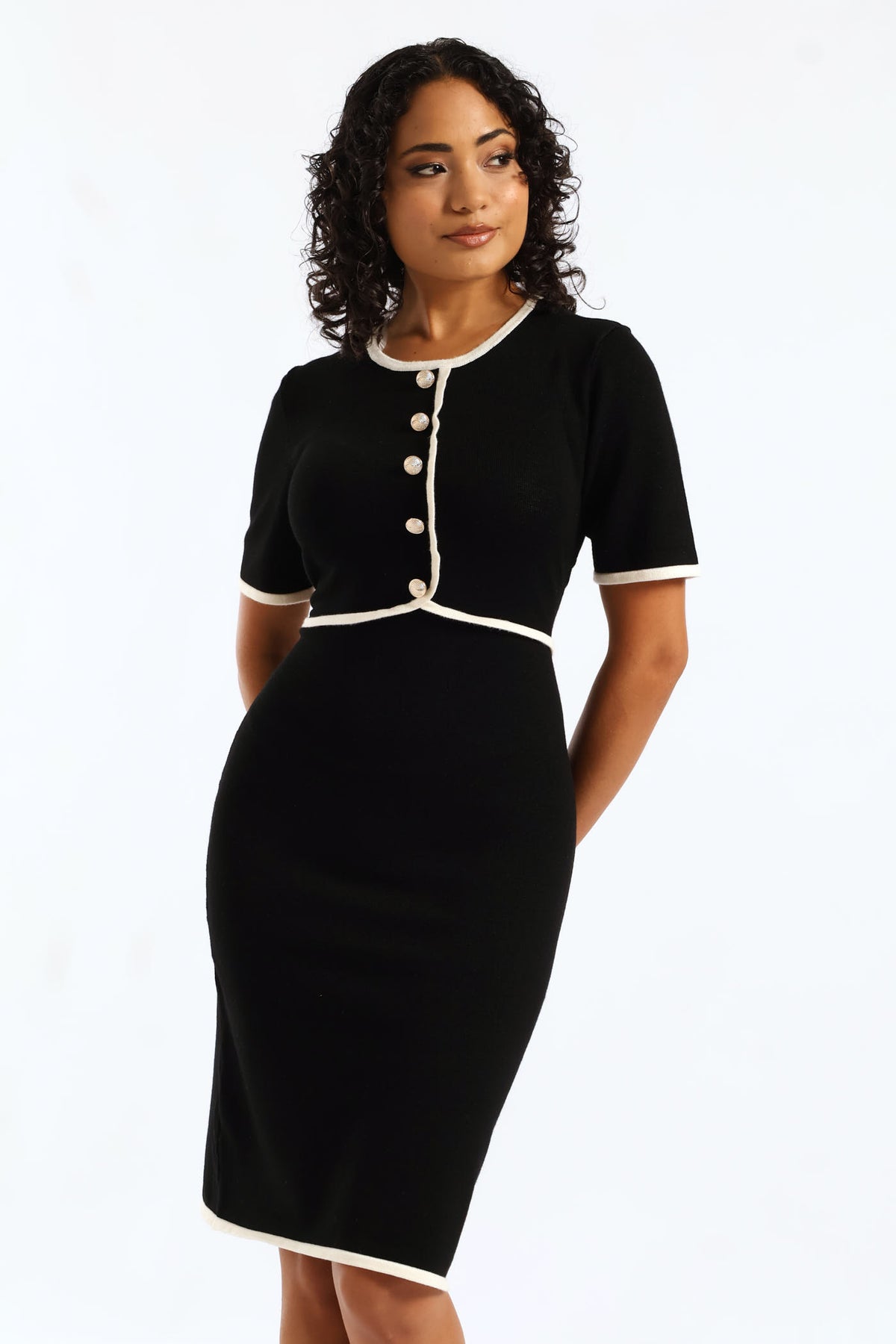 Button Through Contrast Hem Knitwear Dress - Black/Cream