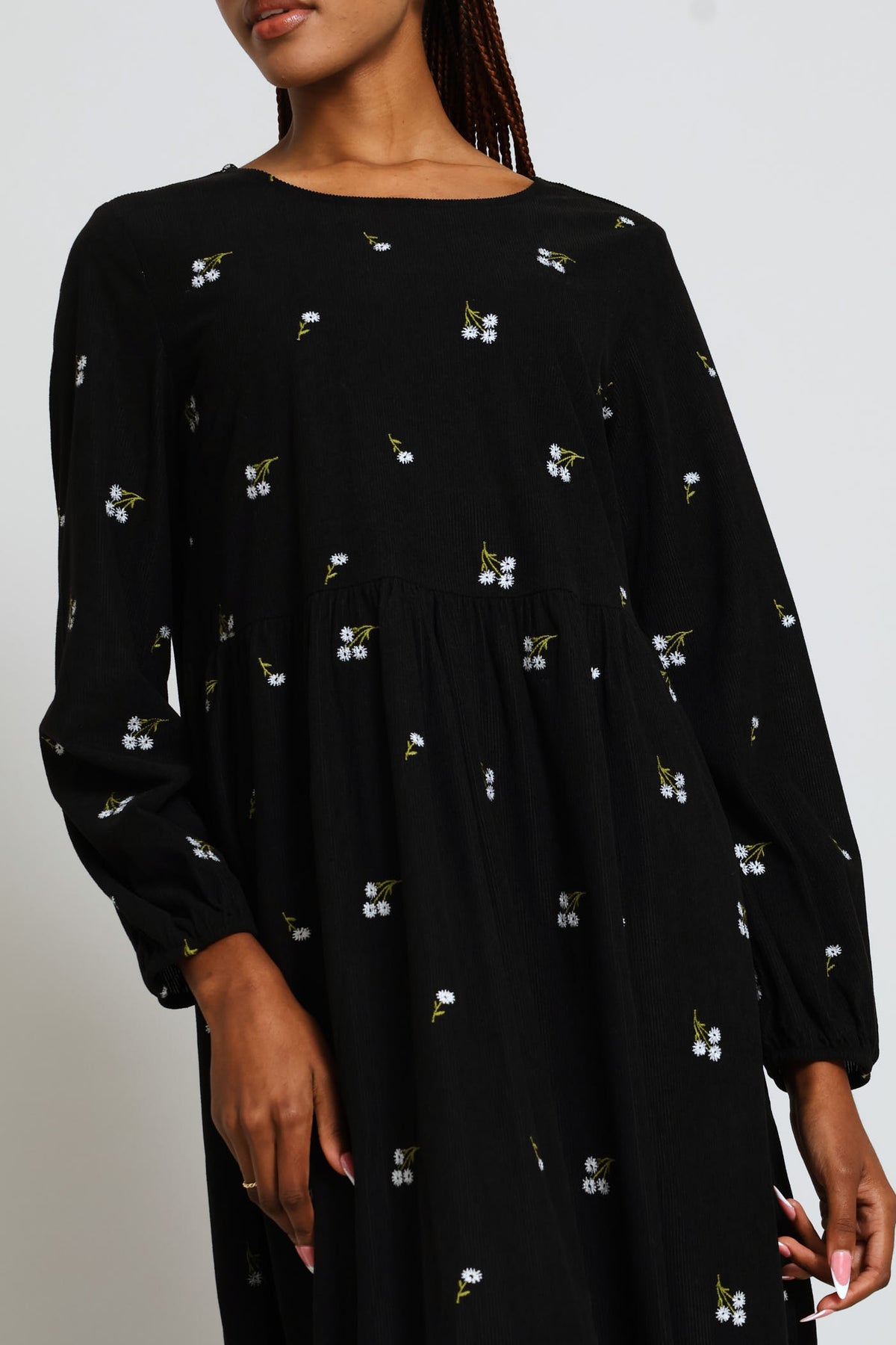 Embroidered Corduroy Tiered Midi Dress - Black