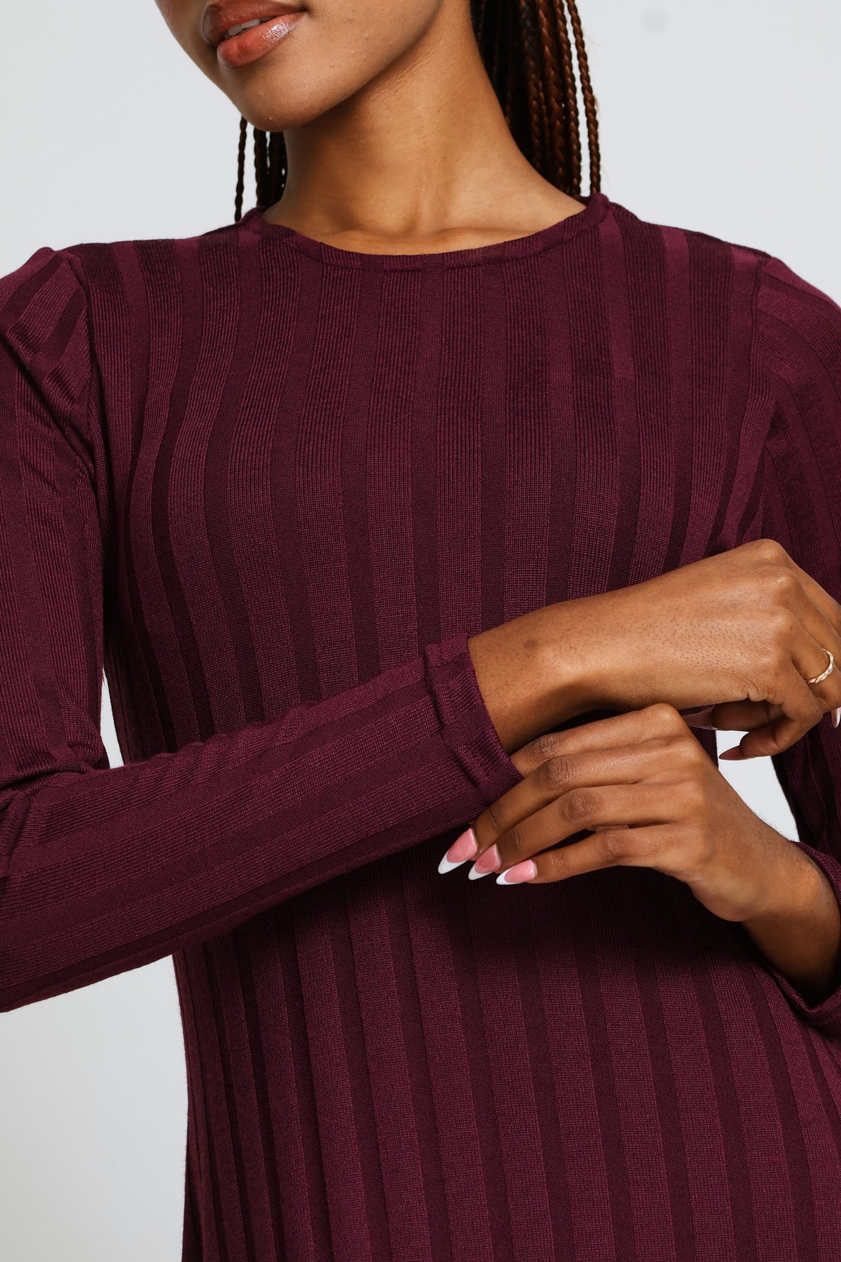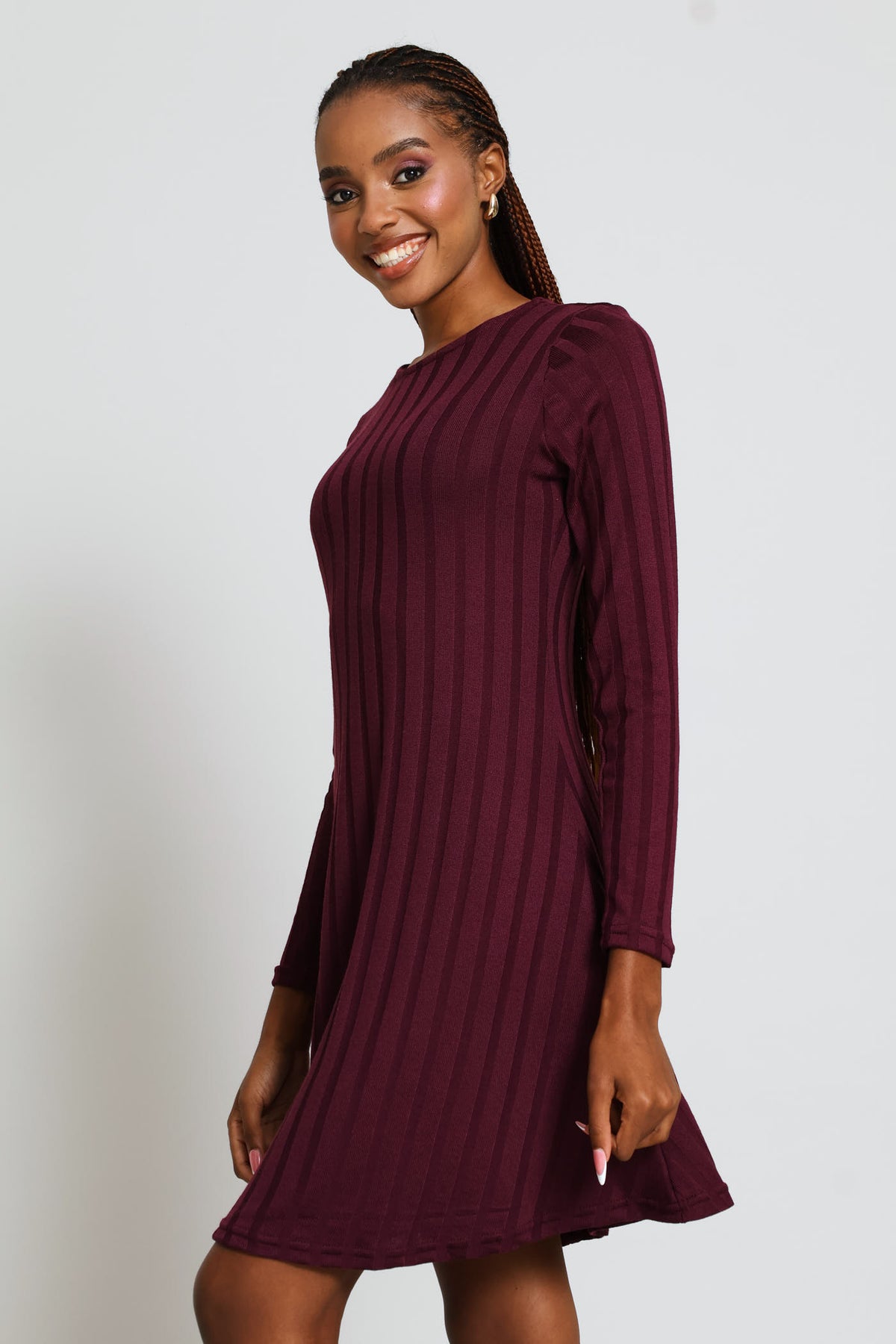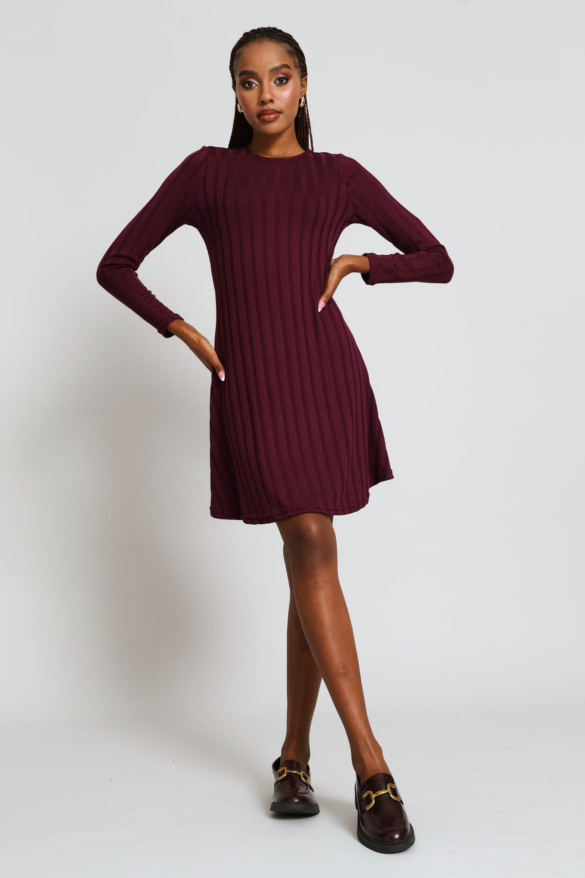 Long Sleeve Ribbed Fit & Flare Mini Dress - Plum