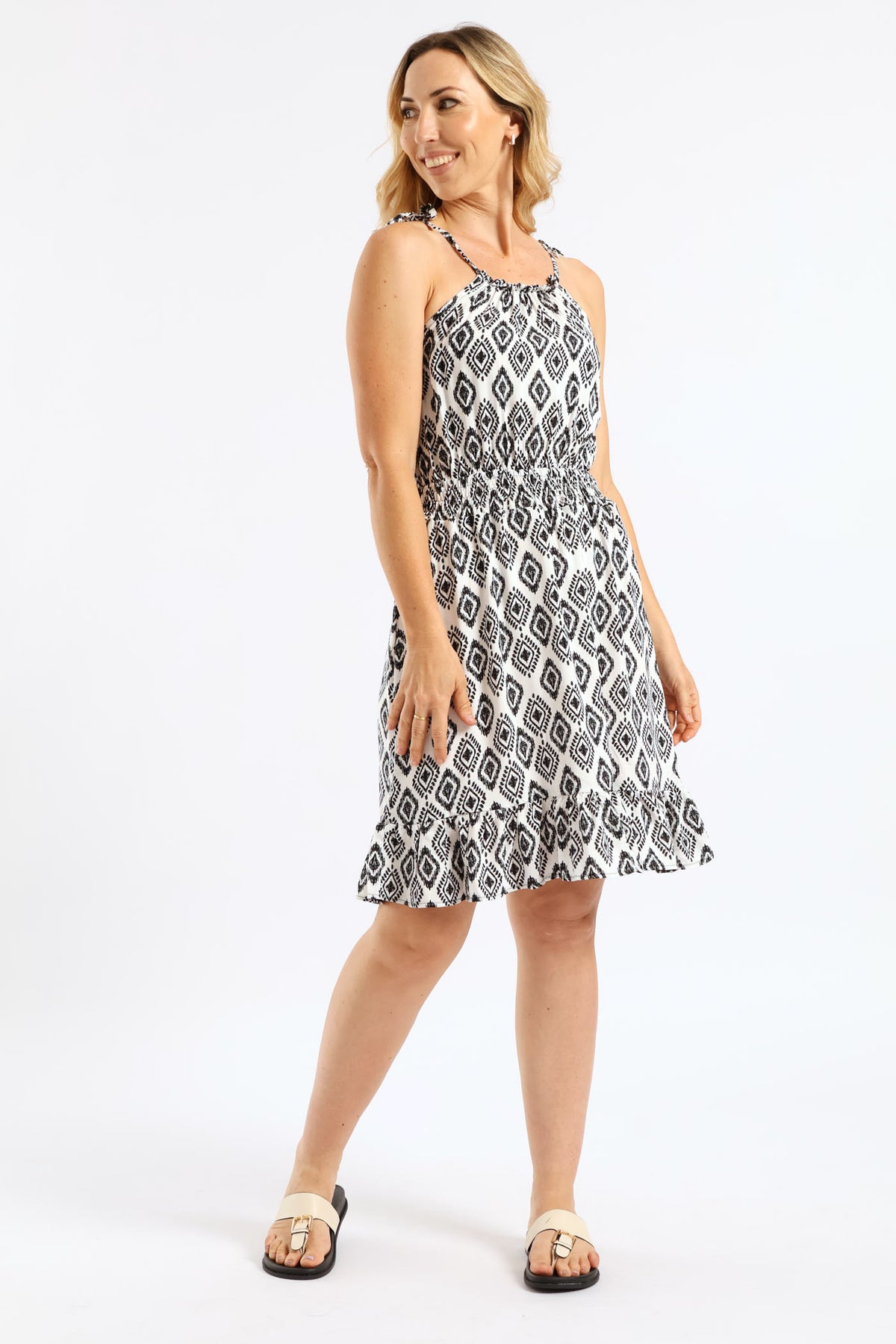 Strappy Shirred Waist Printed Mini Dress - White/Black