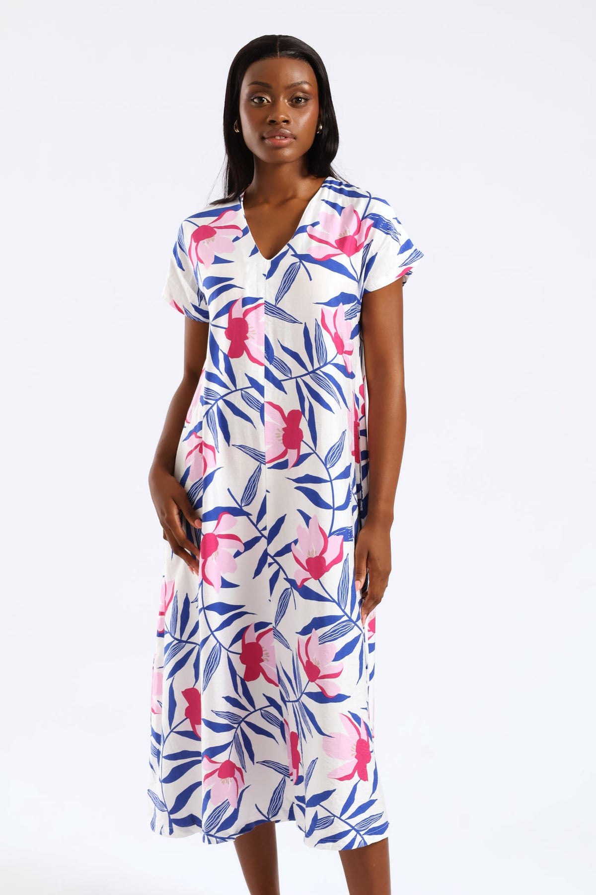 V-Neck Flared Kaftan Midi Dress - White/Blue