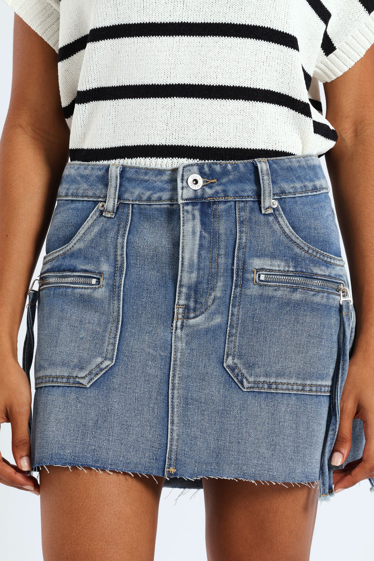 Zip Detail Denim Mini Skirt - Salty Dark Wash