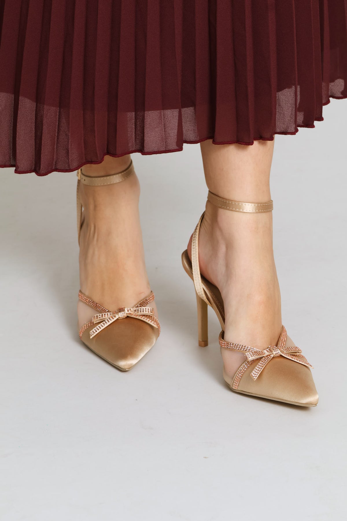 Mesh & Diamante Ankle Strap Mule Heel - Champagne
