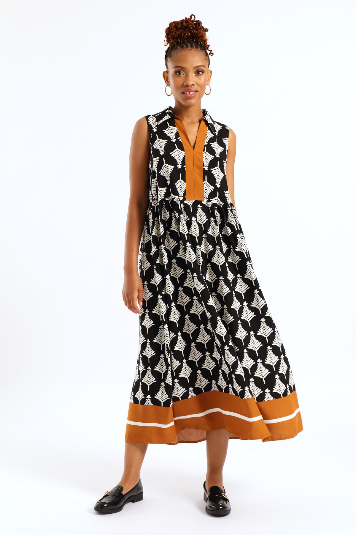 Half Placket Collar Border Print Shift Midi Dress - Black/Beige