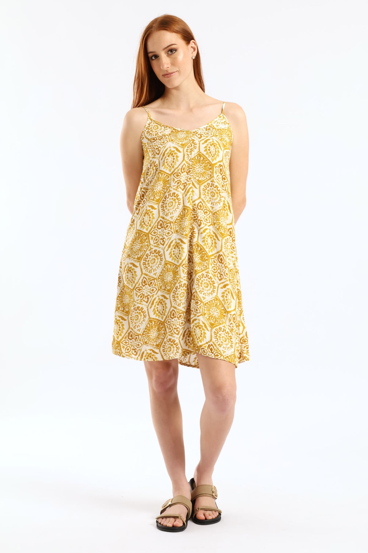 Strappy V-Neck Drawstring Back Swing Mini Dress - Mustard/Cream
