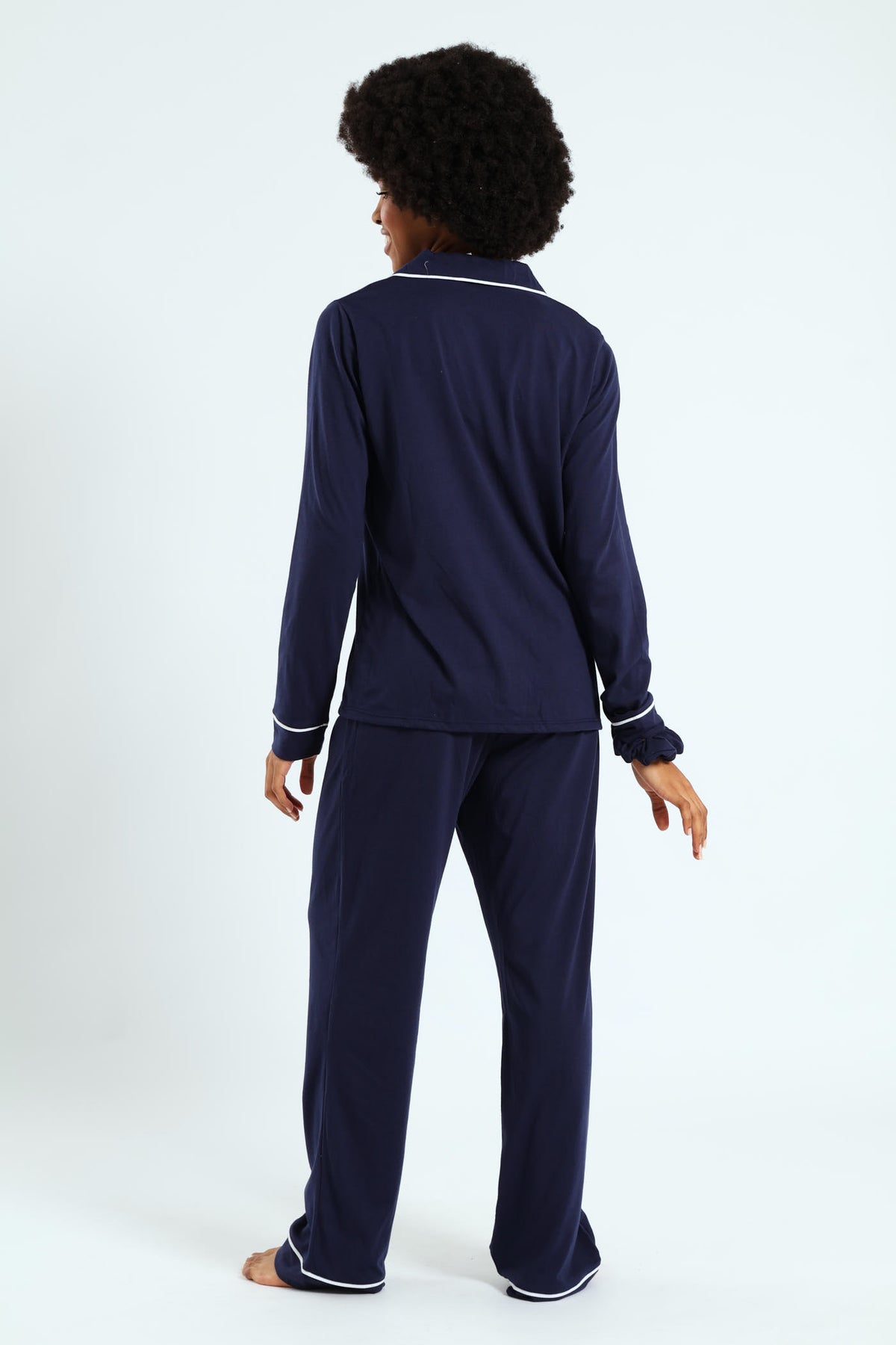 Long Sleeve Button Thorugh & Knit Pant Set With Scrunchie - Navy