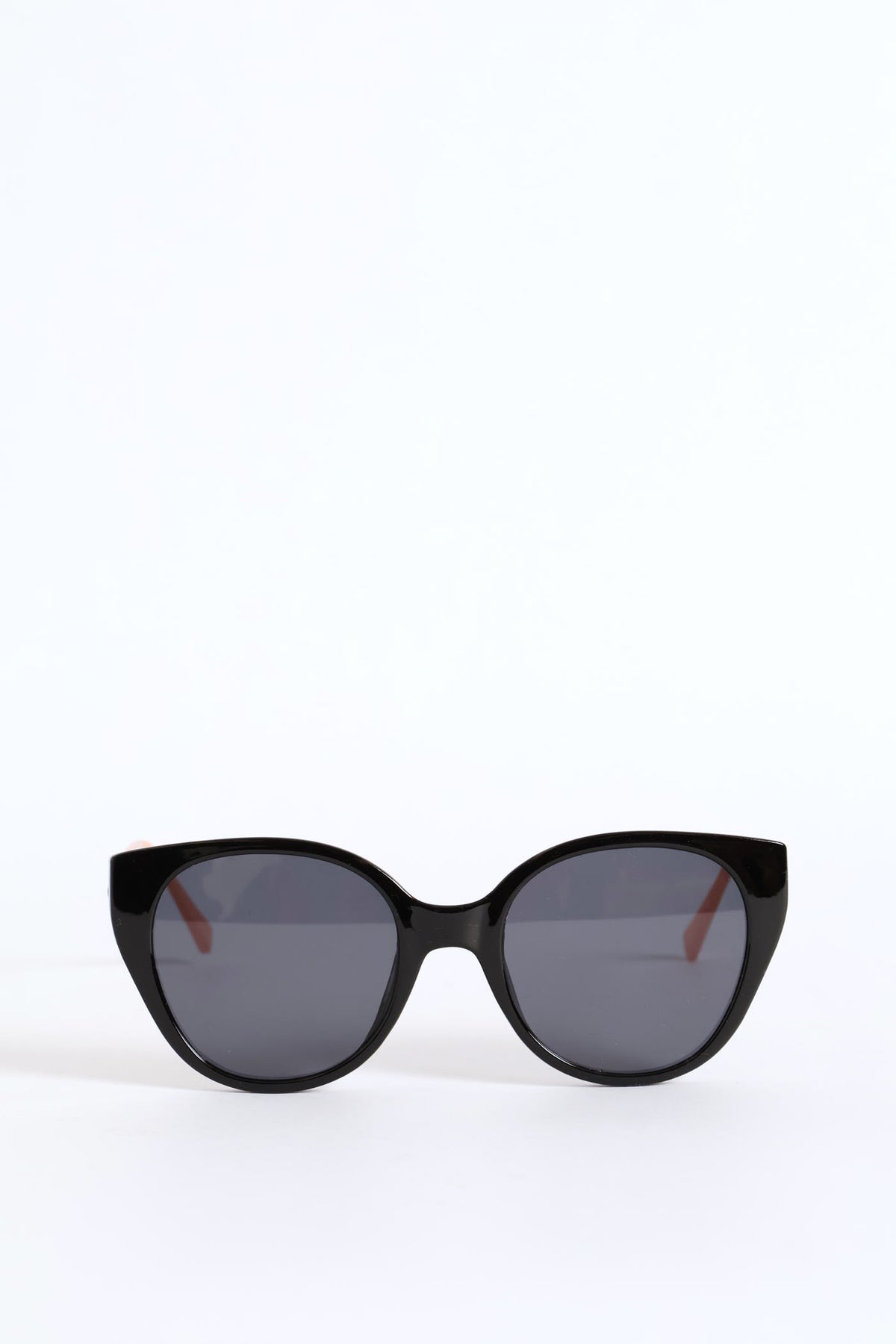 Smoke Lense Rounded Cateye Temple Sunglasses - Black