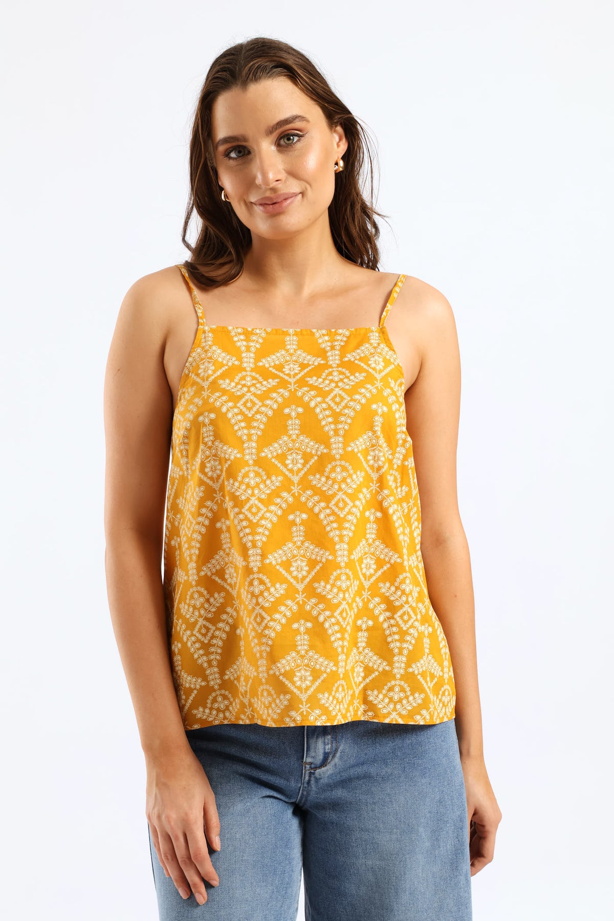 Strappy Hi-Neck Mock Embroidery Tieback Cami - Mustard/Cream